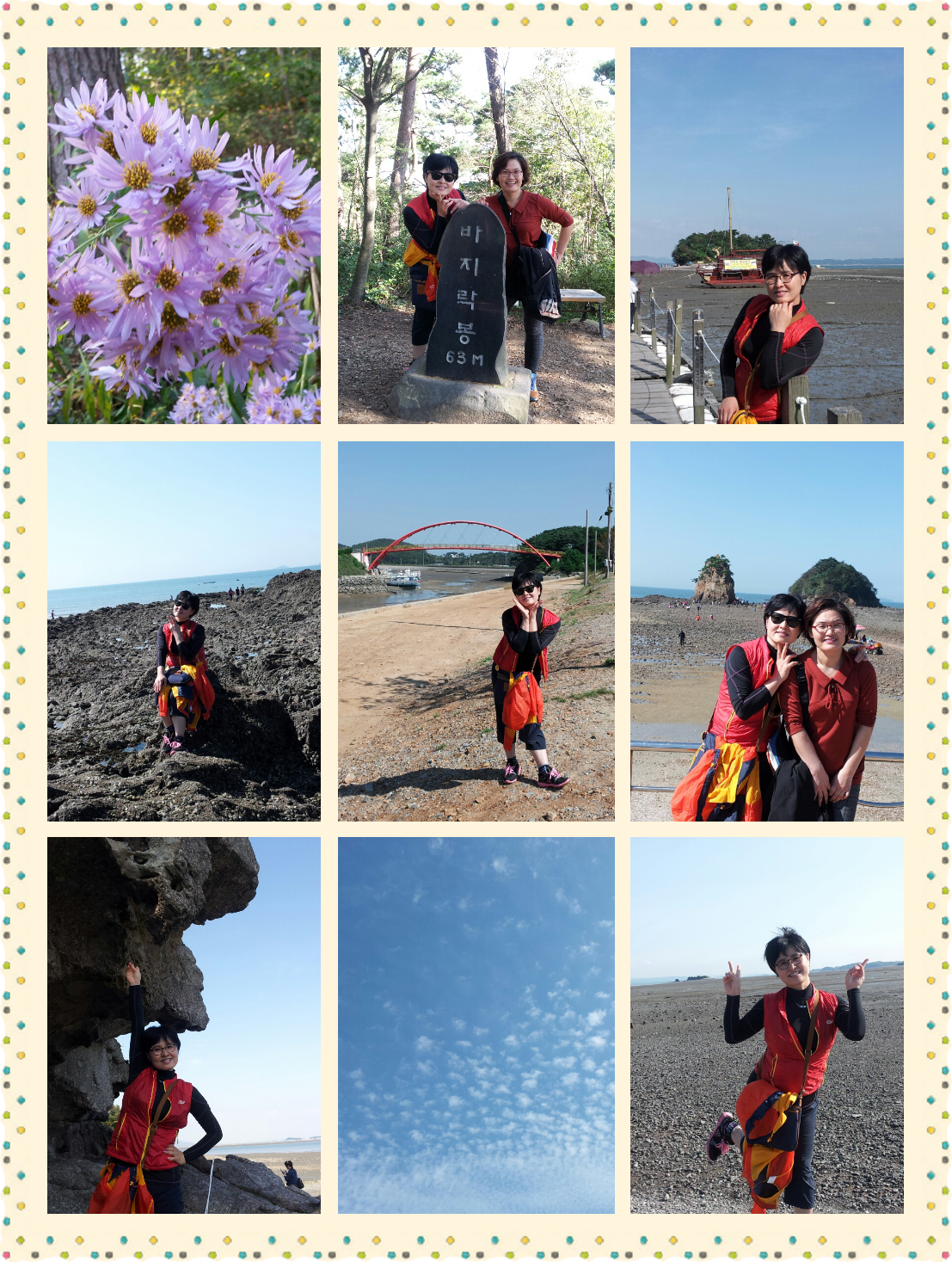 안면도  자연휴양림과 꽃지해변의 바다향기와 대하축제장 그리고 안면암 부교를 지나  기이한 바위들과  논 시간들이 좋았다.