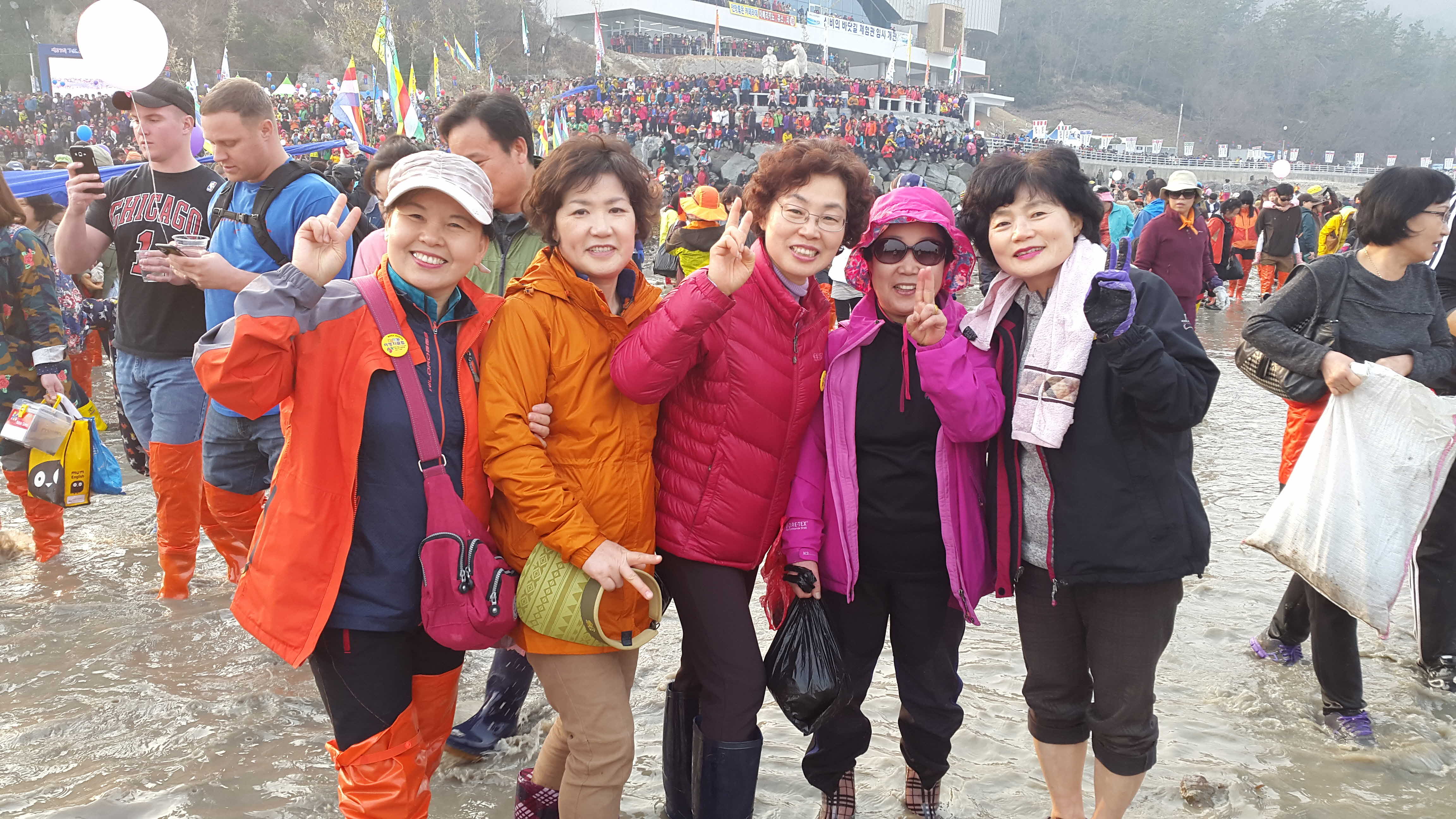바닷길이 갈라지기 전에 미리 들어가는데 얼마나 많은 인파가...그래도 다들 즐거움에 함박웃음