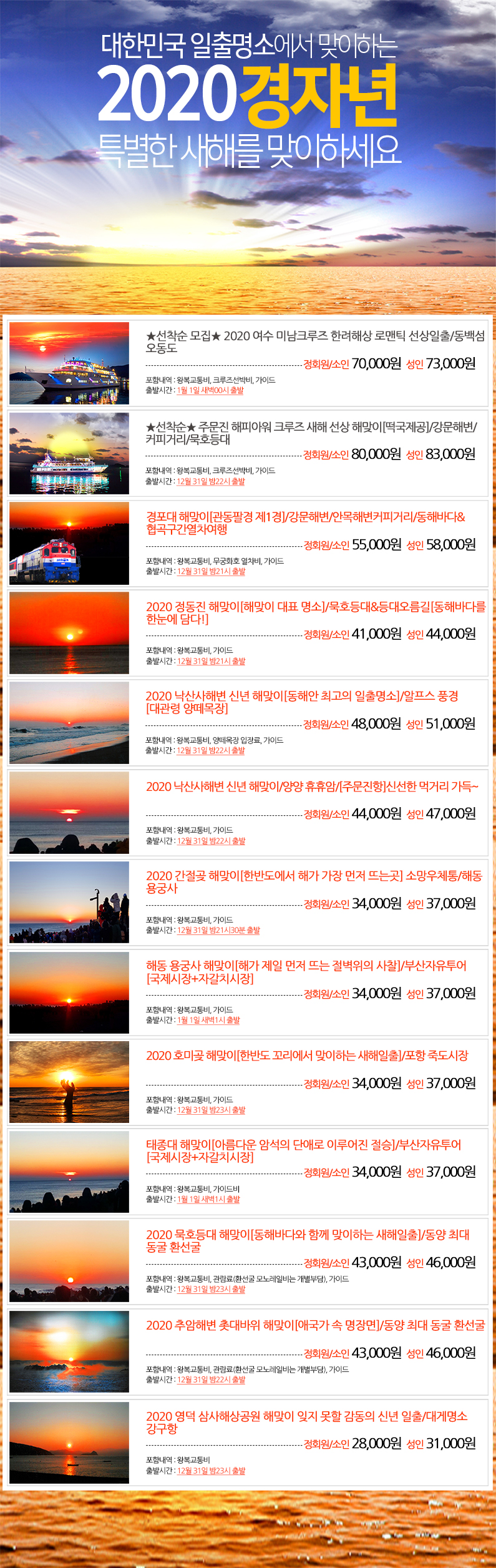 제목 ★2020 경자년 신년 해맞이여행★ 대한민국 해맞이 명소에서 새해소원 빌어보세요~ 등록일 19.11.14 조회 1,744
