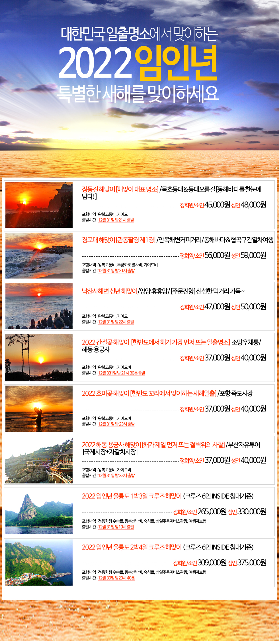 제목 ★2022 임인년 신년 해맞이여행★ 대한민국 해맞이 명소에서 새해소원 빌어보세요~ 등록일 21.11.21 조회 3,478