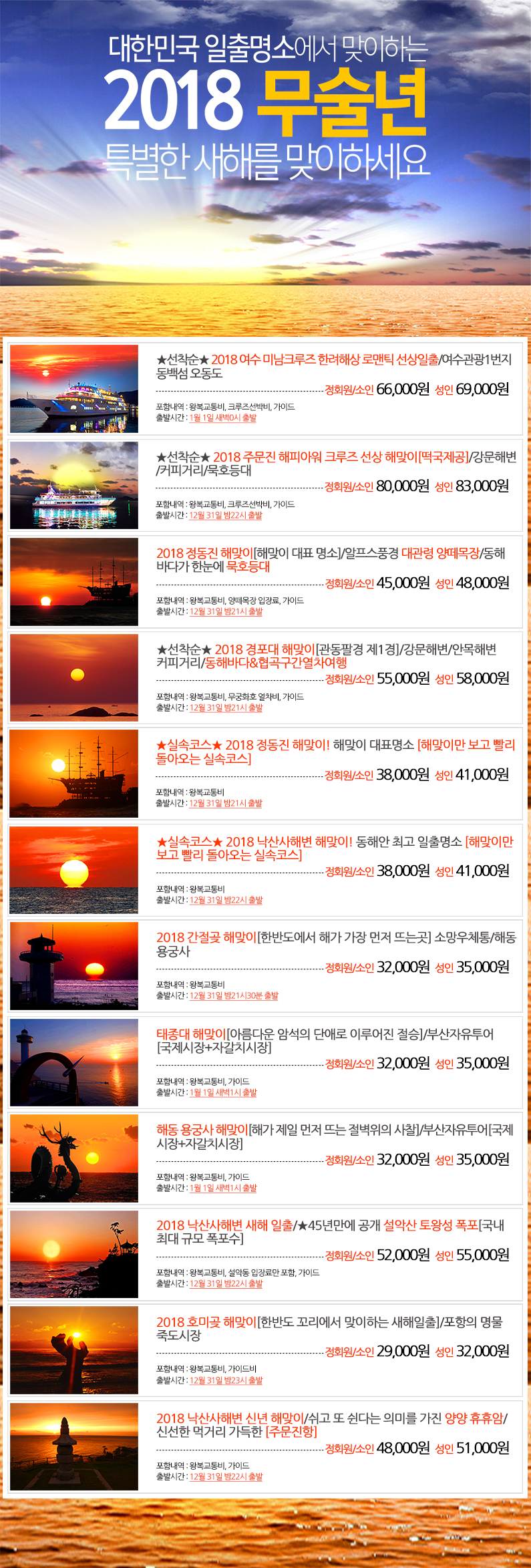 제목 ★2018 무술년 신년 해맞이여행★ 대한민국 해맞이 명소에서 새해소원 빌어보세요~ 등록일 17.11.24 조회 5,105