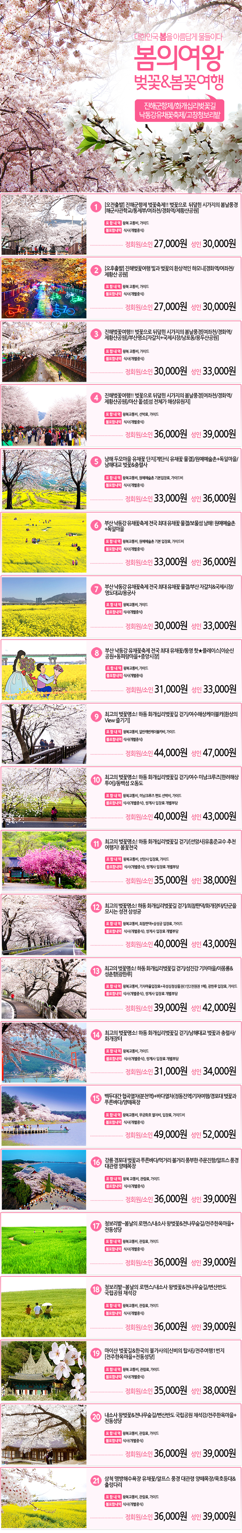 제목 2018 봄의여왕 벚꽃&봄꽃여행 ♥ 진해군항제/화개십리벚꽃길/낙동강유채꽃축제/고창 청보리밭 등록일 18.03.08 조회 4,627