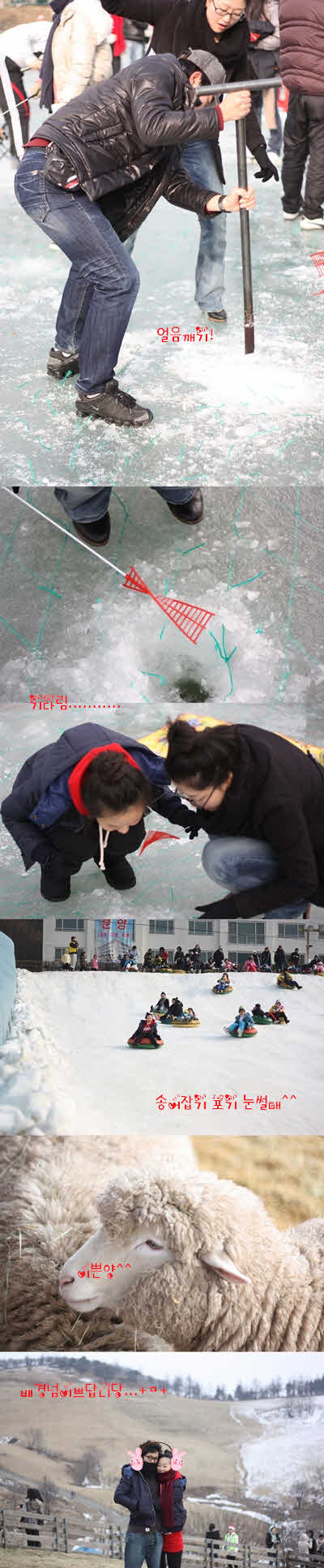 암튼 송어기다리다가 굶어 죽을꺼같애서 밥먹었습니당.! 뭐 메뉴도 다양하고 괜찮았어용 점심먹고 눈썰매 계속탔습니당... 눈썰매 쵝오!!ㅋㅋㅋ 평창에서 한 30분달려 대관령 도착! 내리자마자 칼바람작렬 ㅜ.ㅜ 그래도 넘예뻣어요 산책로 올라가는데 배경도넘이쁘고 사진찍기엔 진짜 넘넘 이뻐용! ㅋㅋ 그치만 칼바람.....^^@@@ 올라가서 양 건초 주고 양 잘먹어요.....ㅋㅋㅋㅋㅋㅋㅋㅋ 아쉬움을 뒤로한체 내려왔답니다 하루 금방가네요 노니깐!ㅋㅋ 암튼 가이드분도 넘넘 친절하셨고 기분좋은 크리스마스 여행이였어요! 감사합니당 수고하세용!@ |
