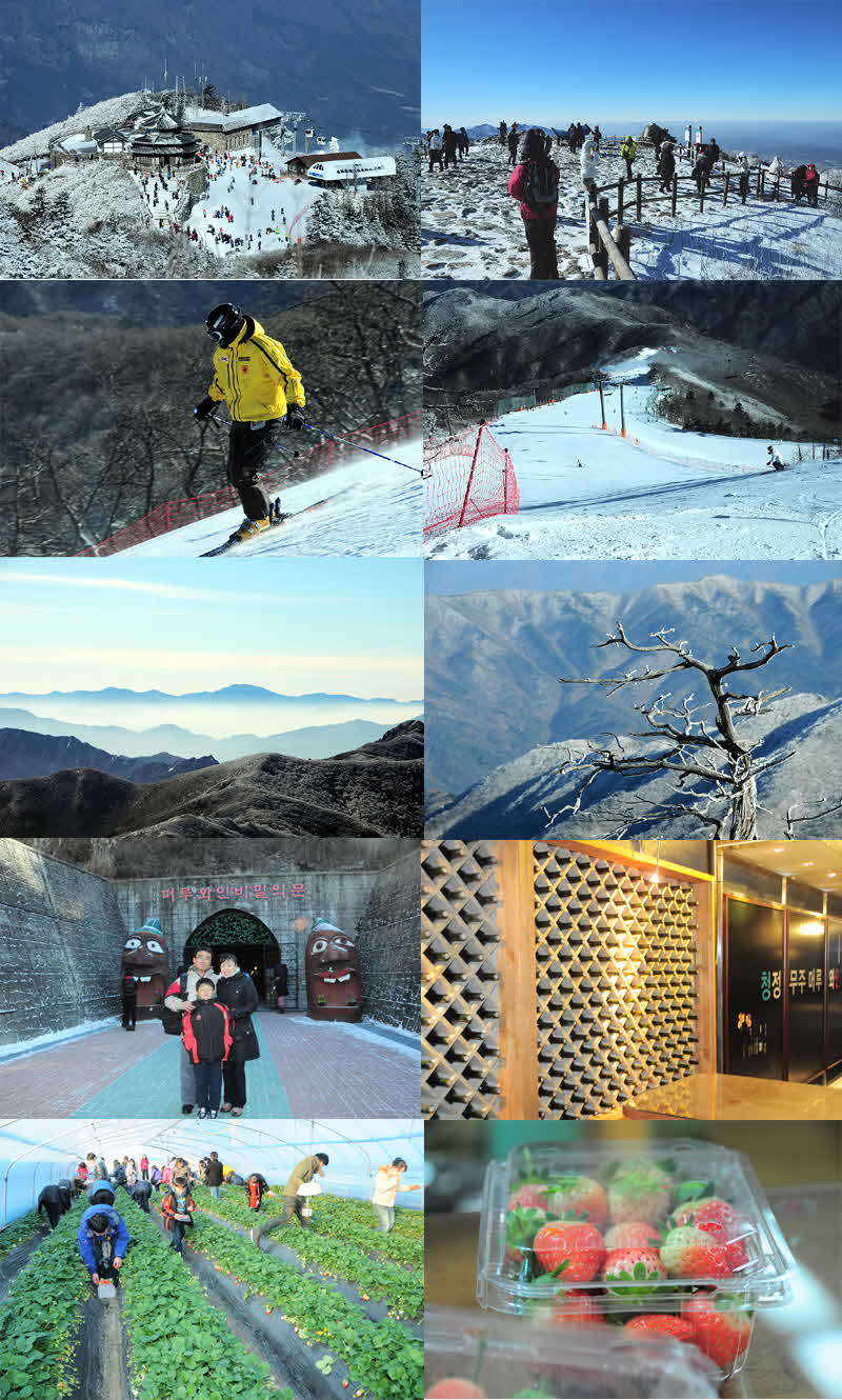1차 남이섬,쁘띠브랑스,영어마을코도 좋았고 2차 갯벌체험,죽녹원코스도 좋았고 3차 무주,와인,딸기 아이가 대구에서는 눈구경못한다고 눈보고싶다고 해서 이쪽코스를 잡았습니다. 몇년전부터 무주설천봉 사진도 찍어보고 싶어고요. 아침일찍 출발해서 도착한곳은 무주,곤도라타고 편하게 설천봉까지 도착. 향적봉까지는 혼자 갔다왔어요. 점심은 소고기뚝배기 정식이 맛있고, 김치찌게도 맛있고.. 머루와인 동굴....가서 와인 3잔 마시고... 거창딸기밭...여기 대박입니다. |