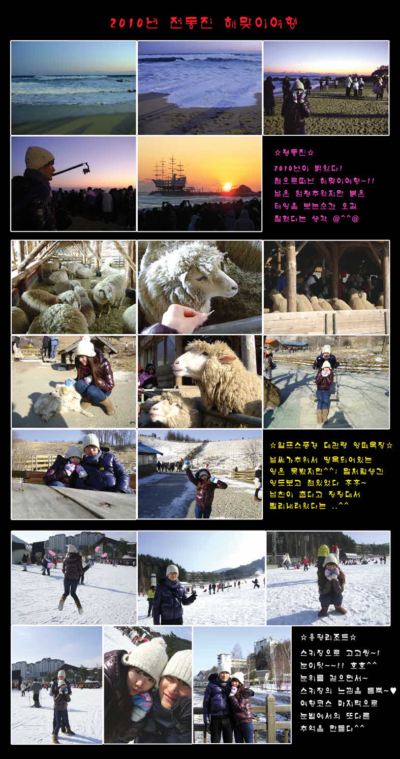 | 제목 | ♬ 2010. 1. 1 정동진 해맞이&양떼목장&용평리조트 ♬ | 등록일 | 10.01.05 | 조회 | 513 |