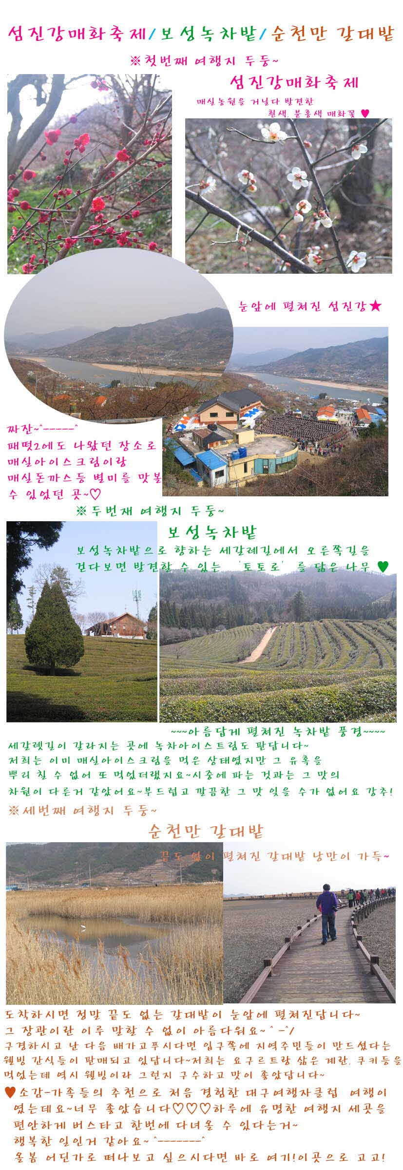 제목 섬진강매화축제+보성녹차밭+순천만갈대밭으로 고고씽! 등록일 10.03.22 조회 542