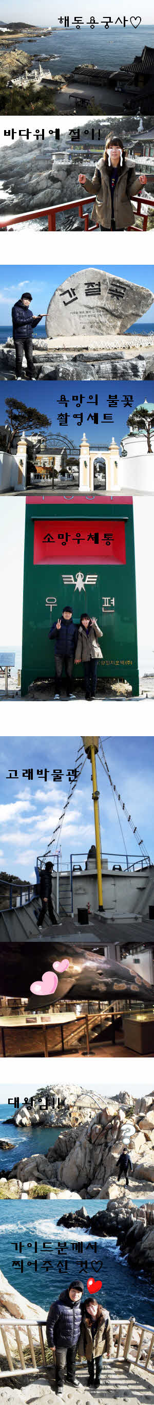 여행사를 통한 여행은 처음이라 걱정도 살짝 했었는데, 다녀와보니 괜한 걱정이었을뿐만아니라 훨~~씬 재밌고 좋았던것 같네요. 각설하고, 장소에 대한 후기 몇자 적어볼께요ㅎㅎ 제일 먼저 간 곳은 해동용궁사입니다. 불교신자가 아니라 불상에 대해선 잘 모르지만, 여튼 사진으로 기념할만한 불상들이 많았던 것으로 기억합니다.