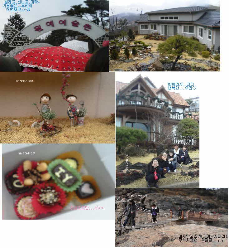 원예예술촌 도착할때까지 봄비가 우릴따라다녔지만,, 완전설레고 신났어요~~~^0^ 다들잠든 조용한 버스안,우린 떠들었답니다,,;; 철없는여자5인,,이멤버로떠난 두번째여행! 원예예술촌앞에서 현지가이드(?)님을만나~ 가이드님 말씀하신그대로 내가살고싶은 원예예술촌! 쵸콜렛만들기체험두,,너무재미지고 신남~~~ 돌아 내려간 독일마을,,아놔~여기도 그림같고이~~~ 드뎌 맞이한 점심시간에,, 말그대로 아름다운 해안선을 따라! 가이드님,,감기로 골골 하시는듯 했는데,, 꽃샘추위로 쵸콤 쌀쌀했지만,, |