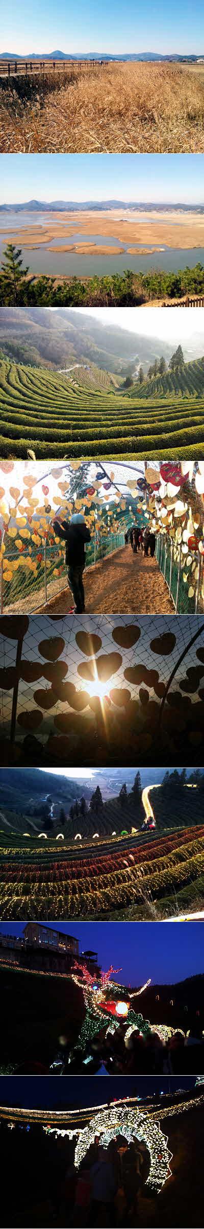 바로 본문으로 고고~ ^^ 첫번째 행선지 순천만은 연안생태습지로 익히 잘 알려진 곳 인데요, 전망대까지 오르는데 어느 정도 시간이 걸리므로 가이드님께서 전망대를 가 볼 계획이면 순천만에 도착하자마자 전망대에 오를 것을 권하셨습니다. 하지만 개인적으로는 이 전망대를 꼭 오르기를 강추하구요:) 순천만 전경을 직접 두 눈으로 확인하는 것도 흔치 않은 경험인 만큼 꼭 그 광경을 보시면 좋을 것 같습니다. 시간이 된다면 갈대밭 사이사이를 다닌다는 유람선과 기차도 타보시는 것도 좋다고 생각되는데 그 만큼 주어진 시간적 여유가 많지 않아서 좀 아쉬웠구요..ㅠㅠ 생태공원 주차장 맞은 편에 식당들이 몇 개 모여 있는데, 꼬막정식이 유명하더라구요. 일박이일에도 나왔다던 ㅎㅎ 두 번째 행선지는 낙안읍성. 하지만 겨울의 낙안읍성은 너무 춥더군요..ㅠㅠ 날씨가 덜 춥다면 산책하고, 사진도 찍고, 체험도 하고 했을텐데 그러기엔 너무너무 칼바람이 장난이 아니었어요..역시 여행은 날을 잘 골라 가야하는 것 같습니다..ㅠㅠ 발효체험, 도자기체험, 짚공예 체험, 천연염색 등 여러 가지 체험활동을 제공하는 집들이 있었는데 미리 체험비, 체험시간, 체험내용 등에 대한 정보를 알고 계획해서 방문하는 것도 좋을 것 같습니다. ^^ 마지막은 오늘 일정의 하이라이트, 보성 다원에서 펼쳐지는 불빛축제였습니다. 불이 켜지려면 좀 기다려야 하니 가이드님께서 근처 찻집에서 녹차라도 한 잔하길 권하셨습니다. 5시 반쯤에 불이 켜졌는데 정말정말 아름다웠답니다. 다원 주변에 녹차 제품을 판매하는 곳이 있는데, 녹차 쫀디기가 의외로 먹을만 했습니다.. ㅎㅎ 하루 동안 옹골차게 액기스만 골라 여행 잘 하고 와서 아주 만족스러웠구요 :) 그리고 제가 식당에 장갑을 놔 두고 왔는데 가이드 님께서 그 다음날 일정 중에 식당에서 제 장갑을 찾아오셔서 택배로 보내주셨답니다..ㅠㅠ 여행을 선택하시는 모든 분들께 조금이나마 도움이 되길 바라며 글을 마칩니다. ^^ |