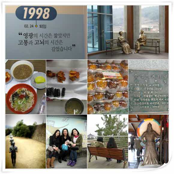 여행지마다 특색있고 이뻐서 너무나 가고싶은충동이 느껴졌던 여행지라 우린 고민할것도 없이 선택을 했어요.. 여행 d-day가 되기만을 손꼽아 기다리던중 전날이되어 홈플러스가서 차에서먹을 음식이랑 추울것을 대비해 손날로구매...여행준비가 다 되자 너무 들떠서 잠도 설쳤어요…ㅎㅎ 아침일찍 일어나 준비하고 홈플러스로 고고씽~~ 차에 탑승하자마자 빈자리가 없을정도로 많은 인원에 헉!!했지만 많은분들과 여행하니 더 즐거웠던거 같습니다. 처음 여행지는 거가대교 휴게소에서 휴식이었는데..휴게소라 생각하면 그냥 간식거리나 먹는곳이라 생각했는데.. 전망대위에서 구경하고 내려와서 간식먹을생각이었던우린 사진찍느라 간식은 구경도 못하고 바로 차를 탔어요.. 다음 여행지인 김영삼 전 대통령 생가와 전시관으로 고고~~ 올해 1월달에 포항에 이명박 대통령님 생가를 다녀왔던지라 다른 대통령생가는 어떤곳일까??궁금함이있던터에.. 대통령들 생가는 풍수지리상으로 터가 좋다는말이있어 좋은기를 많이 받을려고 한참을 이곳저곳 돌아다녔어요…전시관은 청와대에 와있는듯한 착각을 할정도로 티비속에서만보던 것들과 전시물들로 가득했답니다. 세번째여행지는중앙시장에서 점심을 먹으러 가던중 유명한 음식은 가이드님한테 들어서 아는데..유명한 집은 찾기가 힘들어 통영 상인분들께 물어보니너무나 친절한 설명과 함께 밝게 웃어주시던 그 모습이 통영의 인심을 느낄수있어서 너무 기분이 좋았답니다. 추천 음식집으로 가던중 옆에 이순신 장군 거북선이있어서 장군옷입고 체험도 해보고 통영주민분이 사진찍기 좋은장소도 알려주셔서 이쁜사진도 많이 찍었답니다.. 워낙에 먹는걸 좋아하는 우린 통영 유명한 음식 종류별로 다 먹어보자는 생각에 먼저 빼떼기죽과 우짜를 시켰어요.. 빼떼기죽이 고구마,팥,여러잡곡을 넣고 만든음식이라 어떤맛일까 궁금했는데..역시나 토속적이고 고구마 씹히는맛이 좋았어요..우짜는 우동과 짜장을 한번에 먹을수있는음식이었는데 나름 두가지맛을 느낄수있었고 생각외로 어울린 맛이었어요.다음엔 충무김밥먹으러 갔는데..거기엔 1박2일 촬영지라 싸인이 위에 걸려있어 더 신기함과 동시에 그때 이런맛이었겠구나 하는생각이 들었어요.. 가는길마다 꿀빵사는사람들로 가득해서 배가 부른 우리였지만 맛있는집에서 사기위해 여러집에 시식을 해서 젤 맘에 들었던 곳에서 꿀빵도 하나씩구매하고 동피랑 벽화마을로 고고~ 통영여행지중에 사진으로 젤먼저 가고싶다고 느꼈던 벽화마을…마을자체가 워낙 작아서 금방 보고 내려올지알았는데..많은사람들로 인해..사진찍기 기다리다 너무 많은 시간이 흘러서 아쉬웠어요..사진으로 봤던것 처럼 역시나 이쁜 벽화들로 가득했는데 너무 많은 사람들이 구경했어서 그런지 벽화에 낙서를 많이 해놔서 그림들이 조금 훼손된것이 아쉬웠어요. 시간이 얼마남지않아서 빨리 내려와 남망산 조각공원으로 고고싱~ 조각공원에 도착하자마자 눈에 띈 조각품…헉!! 남자동상들이 줄지어 서있는데…남자의 성기가….-- 구경오신분들도 다들 보자마자 안보는것처럼 하시다가 다들 유심히 보시고계셨던듯해요..ㅋㅋ 조각공원을 내려와 조금 추출할때쯤 멍게유곽비빔밥을 맛보려고 찾던중…요즘은 멍게비빔밥만 하고 유곽비빔밥은 안한다는소식을 접한순간…너무 실망스러웠어요..시간도 얼마남지않아서 멍게비빔밥은 먹지못하고 차로 탑승했답니다. 다음 여행지는 통영해저터널로 고고싱~ 해저터널은 역사 기록사건전시를 관람하면서 걸으면되는데 두발로 바다속을 걷는느낌…양옆벽에서 찬 기운이 느껴지는듯했어요..모든 여행이 끝나고 대구로 고고싱~ 생각보다 대구도착이 빨라서 시내에서 더 시간보낼수있어서 좋았고 가이드분이 너무 친절하신 설명과 여행하는동안 많은 사진찍어주셔서 더 즐거운 여행이 되었던것 같습니다. 기사님도 안전운행해주셔서 차에서 많은 시간을 보냈지만 전혀 피곤치 않았구요~ 다들 너무 수고하셨고 즐거운 시간 보내게 해주셔서 감사드려요~~ 여행은 좋은 사람들과 함께인곳 어느곳이나 다 천국같습니다. 여러분들도 좋은분들과 통영여행다녀오세요~추천합니다..^^ |