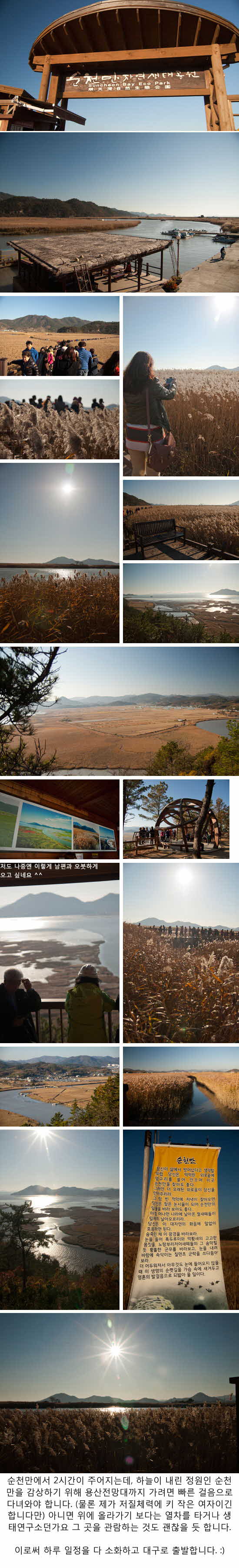 친구들이 다 약속있다고 하고 부모님도 바쁘시기에 더 추워지면 다녀오기 힘들거 같아서 혼자 다녀온 여행이었습니다. 추워서 집에서만 빈둥빈둥댔더니 더 저질체력이 돼서;; 낙안읍성까지 다녀오고 버스에서 가이드님 설명하는 것도 못 듣고 계속 잤었네요. 그리고 순천만에서도 헉헉대며 올라가느라 힘들었네요 =_= 만차임에도 다행히 다들 시간을 잘 지키시고, 가이드님의 설명도 좋았고 버스 운전해주신 기사님도 좋았고 날씨도 좋아서 잘 다녀왔습니다 :) 다녀온 곳들이 다 마음에 들어서 다른 계절에 또 다녀오고 싶네요. |