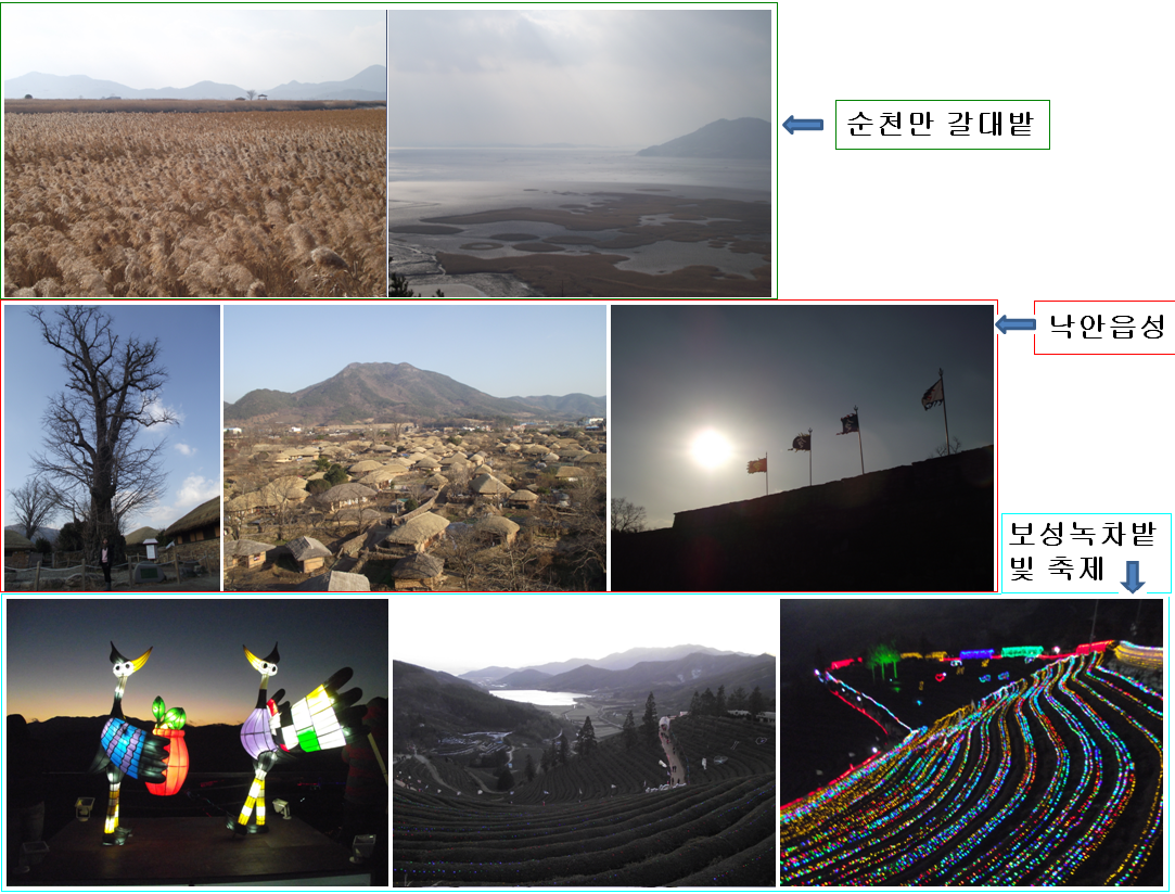 순천만 갈대밭, 밑에서 보는 갈대밭도 좋지만, 전망대에서 바라본 갈대밭은 정말 멋있었어요~ 저희의 저질체력으로인해 올라가는데 조금 힘들었지만 역시 올라가길 잘했다는 ㅎㅎ 낙안읍성의 성곽에서 내려다 본 마을의 모습이 이뻐서 기억에 남더라구요. 성곽을 따라 꼭 거닐어 보세요.ㅎ 녹차밭은 이쁘긴했는데, 등이 달린 부분이 생각보다 너무 작아서..;;; 여름에 넓고 푸른 녹차밭을 보는게 더 이쁠꺼 같아요.ㅎㅎ;;;; 겨울이라 추웠지만, 재밌고 멋진 기억이 남은 크리스마스가 보낸거 같아요~ 담에 또 이용하겠습니다~^^