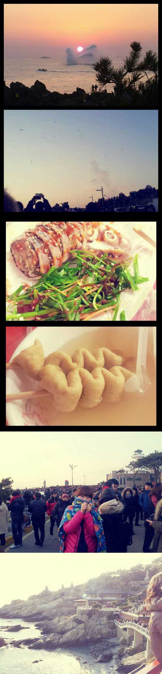 안녕하세요^^ 우선 여행후기에 앞서 대구여행자클럽 가이드분들을 비롯해 글을 읽으시는 모든 분들 새해 복 많이 받으시길 바랍니다^^ 저는 7년지기 친구들과 올해 일출여행을 계획하게 되었고 자주 애용했던 여행자클럽에 접속해서 바로 간절곶 여행을 예약하였습니다 저희는 간단하게 먹을 과자와 음료수를 사서 버스에 탑승하였고, SBS연기대상을 보면서 2013년을 관광버스 안에서 맞이하였습니다^^ 늦은 시간이라 다소 쳐질수 있었던 분위기를 1호차 가이드분께서 특유의 상냥하고 애교스러운 목소리로 분위기를 이끌어 주셨습니다^^ 도착한뒤 사진에 보이는 것처럼 오징어순대와 오뎅을 먹고, 이른 아침 일출을 보기위해서 버스로 돌아와 체력비축을 했습니다~ 아침이 되고 잠이 너무 와서 아침밥을 포기하고 7시까지 취침하다가 일출을 보기위해 버스를 나섰습니다 그리고는 간단하게 챙겨온 음식을 먹고 부산 해동용궁사를 향하였습니다~ 도착하니 간절곶만큼이나 관광객분들이 많으셨습니다 입장하는줄이 너무 길어서 입장을 포기할 생각도 했지만 새해부터 포기는 없다! 라는 마음으로 줄을 서서 기다려서 입장을 했고, 해동용궁사는 역시 기대를 저버리지 않았습니다 바다의 절벽에 위치한 용궁사는 너무 아름다웠습니다 그리고 유명 관광지인 만큼 먹을거리도 굉장히 많았습니다 다 먹지못해 한이 되었지만.. 간식들을 사먹은뒤 버스로 돌아와 대구로 향하였습니다^^ 1박2일 일정이 빠듯할거라고 생각했는데 생각보다 피곤하지 않았고 정말 알찬여행이 되었다고 생각합니다~ 개인적으로 다녀왔다면 해돋이를 보고 부산까지 못다녀왔을텐데 여행사를 통해 다녀오니 계획했던 일정을 다 소화할수 있어서 더 뜻깊었습니다 가이드분께서 불편하신 좌석에서 이동하셔서 많이 피곤하고 힘드셨을텐데 정말 끝까지 웃음을 잃지 않으시고 밝게 가이드해주셔서 또한번 감사드립니다^^ 운전해주신 기사분도 정말 감사드립니다^^ |