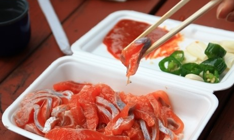 한마리 잡은걸로 회를 해 먹었습니다~송어를 잡아오면 구이나 회를 3000원에 요리해주더라구요~아!초장과 고추는 별도구매해야했어요!