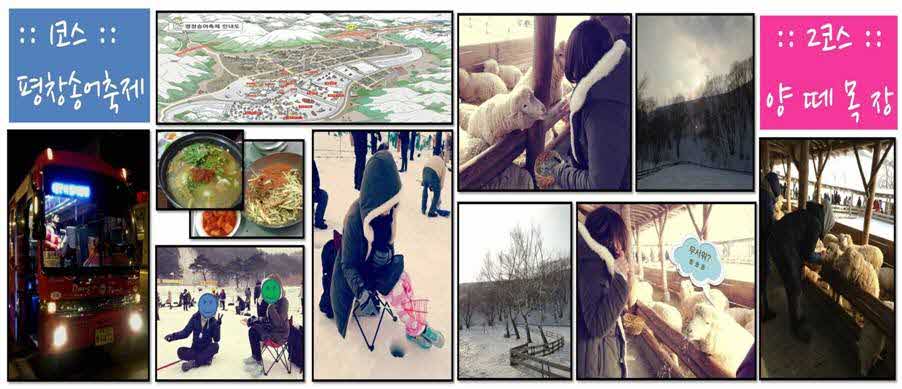 배가 고파서요. 그래서 잡진 못했지만 식당가에 가서 송어를 사먹었습니다.^^ 매운탕, 송어회덮밥을 시켜 먹었는데, 밥시간대를 피해서 갔는데도 사람들이 많더군요 여튼 음식은 추위와 얼음밑 미끼와의 사투를 견딘후라 더욱 맛있었습니다. 전, 성인이라 소주한잔하며 몸을 풀기도 했죠. 그렇게 식사를 하고 나서 축제장을 둘러 보았습니다. 맨손물고기 잡기, 눈썰매장, 얼음장식들, 먹거리 장터등 각종 볼거리, 먹거리를 둘러보며 송어축제는 bye~ 했습니다. ** 참고로 평창송어축제는 가족들이 많이들 오는거 같았습니다. 눈썰매장 등 아이들이 놀거리가 많아서 그런거 같은~^^ ============================ 4시간정도의 평창송어축제를 마치고, 약 1시간 조금 넘는 이동으로 대관령 양떼목장에 도착합니다. 양떼목장. 여름에 푸르른 초원이 있을때 다녀왔었는데, 이번에 눈이 쌓인 대관령의 모습은 또다른 장관이 펼쳐지더군요. 사진도 찍고, 눈으로 마음으로 감동을 느끼며 등산로를 따라 쭈욱 돌다가, 축사에 도착했습니다. 건초를 바구니로 받구, 양들에게 본격 건초를 주기 시작합니다. 근데 요것들이 낼름낼름 잘 받아 먹습니다~. 뭐 살짝 깨무는거 같아도, 하나도 아프지 않습니다.(( 겁 먹지 마세요^^ )) 저는 동물을 좋아해서 건초주고 쓰다듬어 주고, 그리고 한놈(?)만 집중하지 않고 주위에 다양한 양들에 건초를 나눠주며 사진찍고 놀았습니다. 아, 그리고 양떼목장에 양치기 개들이 있는데 요놈들, 사람을 참 반가워 하더라구요^^ 추워서 그런지 집안에 들어가 있는데 부르면 나와서 반겨줍니다 양들도 보시고, 양치기 개들도 사랑으로 보담들어 주시길^^