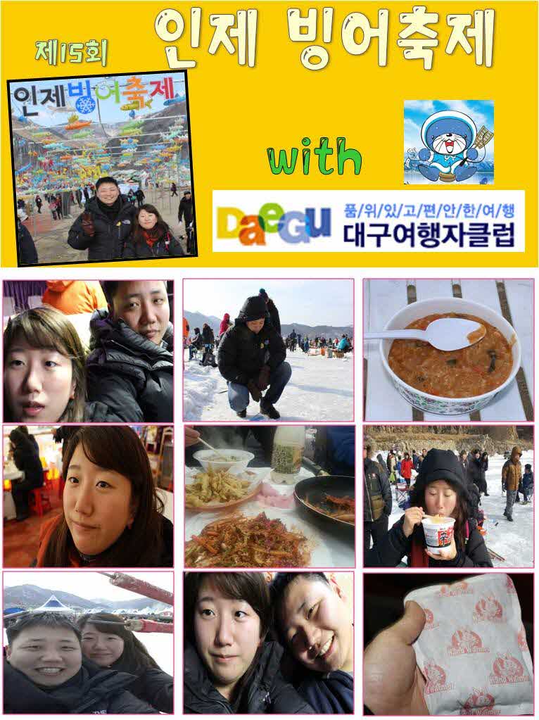 안녕하세요 벌써 대구 여행자 클럽을 알게된게 바로 엊그제 같은데 11년부터 알았으니깐 이제 약 2년차 정도 되었다고 보면 되겠네요. 강원도 인제 빙어축제를 가게 된 이유는 제 남자친구 덕분이었습니다. 남자친구가 강원도 인제군에서 군 훈련을 했을 때 강태공이 되어보자는 마음으로 평소 즐겨했던 낚시대도 챙겨가고, 그렇게 출발하여 10시반이 조금 넘어서 강원도 인제에 빙어 낚시와 관련해서는.. 총 1만 5천원의 낚시 비용을 지불했지만 이 저희의 아쉬운 마음을 몰라주는 빙어는 그냥 먹이만 쏙쏙쏙 빼먹고 가더군요 한시간 반쯤하다가 도저히 못할 것 같아 포기하고 그때부터 여러가지 축제 구경을 했습니다. 배도 조금 고프고 해서 돌아다니면서 500원짜리 정말 맛있는 어죽도 먹고, 군부대의 사격도 체험해보고 무료로 나눠주는 솜사탕도 먹고 또 참 소양호가 잘 얼려져있어서 썰매 타기엔 적절한 공간이었는데 어렸을때 아빠가 직접만들어줘서 함께 탔었던 그 썰매를 기억하게 하는 그래도 가장 기억에 남는건 빙어 튀김과 빙어 도리 뱅뱅 그리고 빙어 무침이었네요. 참 그 산지에 가면 먹어보지 못하는 싱싱하고 맛있는 강원도 옥수수 막걸리와 함께 즐거운 벗과 먹고 배부르니 이 또한 여행의 묘미라고 생각합니다 어떻게 보면 여러가지 체험은 하지 못했지만.. (3시반에 출발해야되는 버스이기때문에^^/ 밤에만 볼 수 있는 빙어로 만들어진 등도 못본게 아쉽긴합니다..) 그래도 사랑하는 사람과 함께 대구에서는 체험할 수 없는 여러가지 체험들을 할 수 있어 좋았던 것 같습니다.