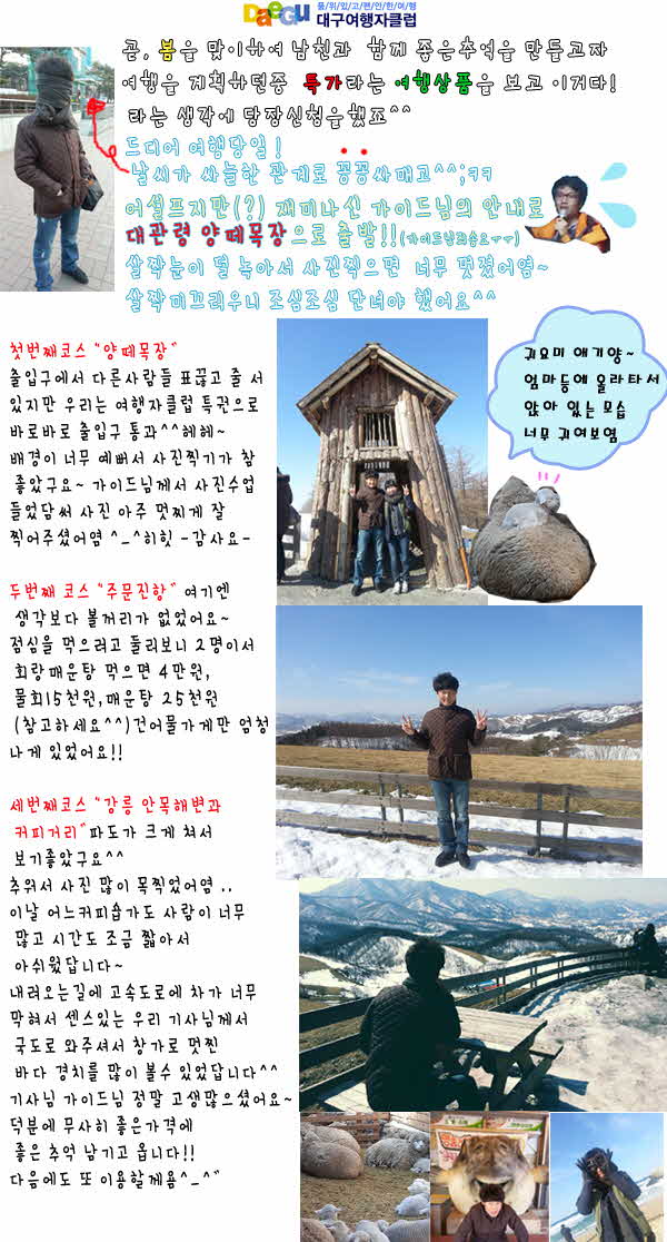 제목 대관령양떼목장.주문진항.강릉안목해변과커피거리코스 등록일 13.03.04 조회 581
