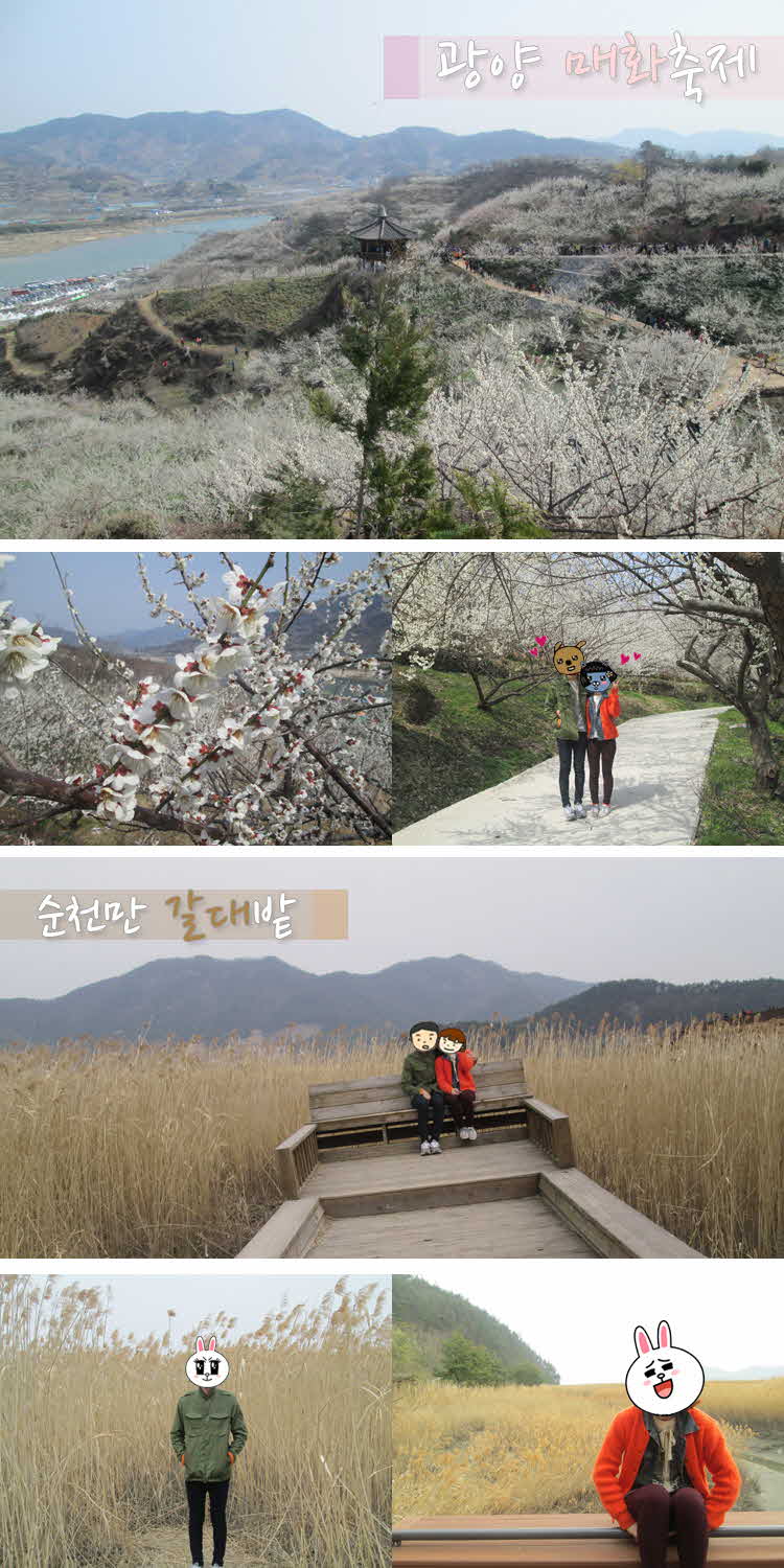 2013.3.24(일) [광양매화축제, 오동도, 순천만갈대밭] 다녀왔습니다! 봄꽃이 활짝피어서 나들이 제대로 하고왔어요^^ 오동도에서는 둘이 많이 지쳐서 살짝 산책하고 내려와서 갈대밭은 나중에 가을에 한번더 가보고싶은곳이에요! 건의사항이 있다면 관광지를 한 2곳으로 해서 관광할곳 2곳 다녀오고, 4시쯤 대구도착하는 코스가 생겼으면 아무튼 이번 여행 정말 즐거웠답니다! |