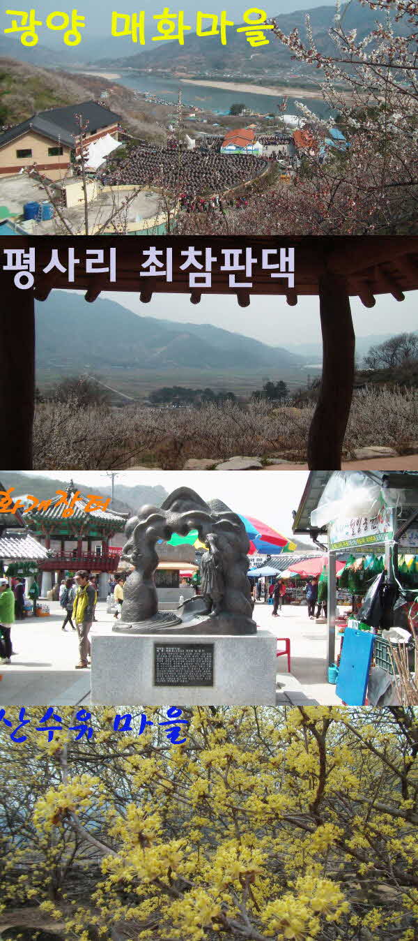 3월의 마지막 날, 남도 꽃 여행을 하고 싶어서 여행자 클럽을 찾았고 매화 축제, 최참판댁, 화개장터, 산수유 마을 코스가 있어서 선택한 여행이었습니다. 오늘의 여행은 미녀가이드 홍정민 양과 함께였는데, 어린 나이에도 불구하고 여행객들을 따뜻하게 감사는 모습과 여러 축제가 겹쳐서 일정대로 움직일 수 없는 상황에서도 적절하게 대처하여 편안히 안내하는 모습을 만난 것은 이번 여행의 또 다른 아름다움이었습니다. 이 자리를 빌어서 고맙다는 말 전하고 싶습니다. 고마워요 미녀가이드님~ 혼자 떠난 여행이었는데 뜻밖에도 만난 후배 동료의 아름다운 모습은 나의 젊은 시절을 생각하면서 빙그레 웃을 수 있었습니다. 매화마을, 최참판댁, 화개장터, 지리산 산수유 하위 마을 여행을 이야기와 동영상으로 담아 봤습니다. 광양 매화 마을이야기 매화마을_섬진강의 유래 지리산에서 흘러간 물이 남해로 가는 가면서 아름다운 섬진강이 됩니다. 섬진강의 한자는 두꺼비섬(蟾) 나루진(津) 강강(江)을 쓰고 있습니다. 고려 우왕때 왜구가 섬진강 하구를 침입했을 때 수십만 마리의 두꺼비가 울부짖어 왜구가 광양쪽으로 피해갔다고 하여 섬진강이라고 불렀다고 합니다. 두꺼비 소리에 왜구가 피해갔다는 이야기 실제 두꺼비 소리를 들어보면 거짓은 아닌 듯합니다. 두꺼비 소리 들어 보기 http://9594jh.blog.me/181435107 매화마을_섬진강 부교 전라도와 경상도를 가로지르는 섬진강을 연결하는 멋스런 다리 섬진강 부교입니다. 요즘은 섬진강을 다리를 통해 쉽게 거널 수 있지만 예전에는 배가 주였을 듯합니다. 경상도와 전라도를 멋스럽게 연결해 주는 다리가 섬진강에 있었습니다. 매화 축제가 열리는 전라남도 다압면의 수월정과 경상남도 하동 만지를 연결하여 설치된 섬진강 부교는 섬진강 물 위를 걷는 듯한 느낌을 주었습니다. 흔드리며 걷는 것도 즐거운 일이었지만 정자에서 부교를 건너는 사람들을 보는 것도, 벚꽃 잎 사이로 흔들리는 사람들도 멋진 풍경이었습니다. 그런데 아쉽게도 매화 축제 기간에만 운영한다고 하네요. 내년을 기약해야 할듯 섬진강 부교 동영상으로 보기 http://9594jh.blog.me/184103808 매화마을_섬진강 수월정 부교를 건너면 강가에 정자가 있습니다. 이곳이 조선 선조 때 나주 목사를 지낸 정설이 지은 정자 수월정(水月亭)입니다. 풍광이 아름다운 곳이라 송강 정철이 수월정기를 짓기도 했습니다. 수월정기 수월정의 풍광을 다음과 같이 노래했습니다. 달빛이 비추니 금빛이 출렁이며 그림자는 잠겨서 둥근 옥과 같으니 물은 달을 얻어 더욱 맑고 달은 물을 얻어 더욱 희니 곧 후(=정설)의 가슴이 맑고 투명한 것과 같다 수월정 옆에는 배 모양의 섬진강 유래비와 수군 별장들의 공적을 그린 비석의 흔적인 석비좌대가 자리하고 있습니다. 유적비와 섬진강 구비와 산자락을 한 눈에 볼 수 있는 정자안의 풍경과 정자 밖의 풍경 속에서 빠져 보는 것이 좋았습니다. 정자 밖에서 바라보는 경상도와 전라도 매화 마을과 강물도 사람들을 이끌고 이었습니다. 달이 있는 밤은 아니었지만 그리고 많은 사람들이 있었지만 수월정은 수월정이었습니다. 수월정의 모습 동영상으로 보기 http://9594jh.blog.me/184104782 매화마을_섬진강 매화마을 노고단에서 바라본 섬진강 구비구비가 하류로 내려오면서 또 다른 구비를 만들고 있었습니다. 강변 수월정에서 바라본 산자락 섬진강 매화마을은 꽃 천국이었습니다. 사실 섬진강 왼쪽 전라남도 쪽은 모두가 매화 마을이지만 이곳에 청매실 농원과 영화 취화선의 배경이 되고 다양한 이야기들과 함께 해마다 축제가 벌어지는 곳입니다. 매화가 가득한 섬진강이 보이는 광양 매화 마을의 모습입니다. 매화마을 영상으로 보기 http://9594jh.blog.me/154529696 매화마을의 낙화_매화가 떨어지면 매화마을에는 작은 연못이 있습니다. 떨어진 꽃잎이 물을 만나 또 다른 볼거리가 됩니다. 꽃잎이 날린 것은 아마도 바람 때문이었겠지요 그러나 떨어진 꽃잎이 물위에서 또 다른 아름다움을 만들어냅니다. 아마도 조지훈 선생님이 이곳에서 낙화를 쓴다면 또 다른 낙화가 나오지 않았을까요. 작은 나무에서 떨어진 꽃이 물결에 흔들리는 모습은 아름답게 단장한 여인도 더욱 두드러지는 그대로 동양화였습니다. 매화 마을에서 만난 연못과 만난 매화와 그리고 또 다른 낙화 두 가지 영상입니다. 매화 낙화 두 가지 영상 보기 http://9594jh.blog.me/184110958 매화마을_장독이 있는 청매실 농원 풍경 한 여인이 시집와서 50여년을 가꾸어온 결실이 청매실 농원이라고 합니다. 매화나무가 그 증거기도 하지만 그 열매를 상품화하고 널리 알리게 된 것은 그 분의 업적이겠지요. 섬진강 푸른 물결과 어울려 피는 매화꽃 너머 매실이 익어가는 우리의 옹기는 말없이 그것을 말하고 있는 듯합니다. 장독이 있는 청매실 농원 풍경 보기 http://9594jh.blog.me/184123103 매화마을_굴뚝과 연기가 있는 풍경 아마도 요즘 젊은이들에게는 별다른 의미가 없는 것이겠지만, 어른들에게는 굴뚝에 연기 나는 것이 추억어린 풍경이겠지요 저도 시골에서 자라난 저에게는 시골의 초가가 아니라도 저녁 무렵의 시간이 아니라도 굴