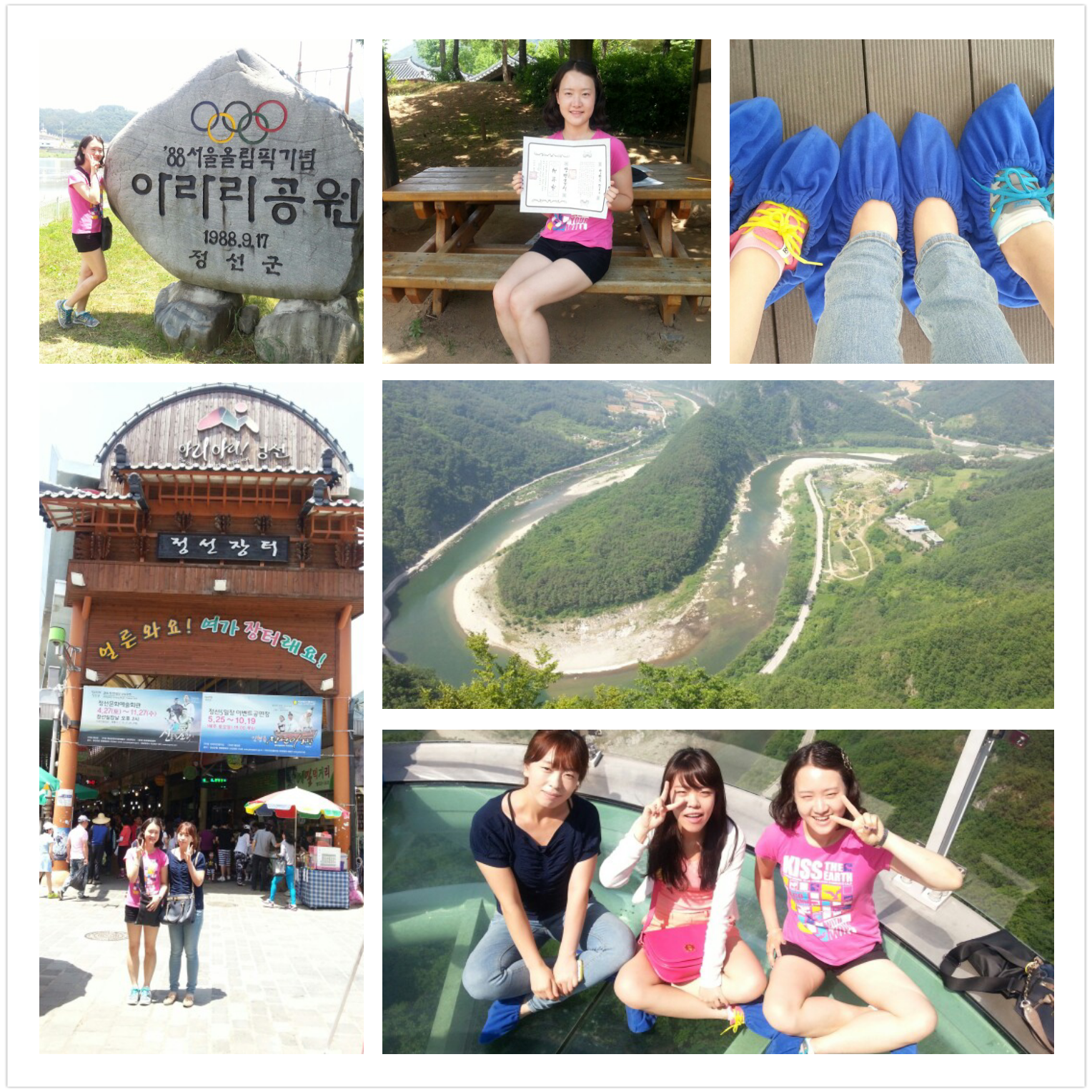 부푼 가슴을 안고 친구2명과 함께 여행을 갔었다. 우린 알고지낸지 벌써 7년이라는 시간이 흘렀지만, 항상 바쁘다는 핑계로 만남을 약속하면 시내에서 봐서 우리에게 추억은 그다지 많지 않았다. 그래서 나의 제안으로 큰 마음먹고 여행을 가기로했다. 이름하여 강원도꽃미녀여행기! 가는데 시간이 오래걸리긴했지만, 안전하게 운행해주셔서 친구들이랑 얘기한다고 시간가는줄 모르고갔다. 첫번째 도착지는,스카이워크 ! 1박2일에 나와서 유명세를 타서 그런지, 관광객들도 더 많아보였다. 미끄러짐을 방지한 덧버선처럼 생긴것을 운동화에 끼우고 신나게 구경을했다. 밑이 아찔할 정도로 다 보여서 재미있었고, 신기한 경험이였다. 경치도 좋고, 날씨는 더좋고 무더운 6월이였지만, 대구지방과는 다르게 덜 덥고해서 여행지로 오기 딱 좋았다. 기분좋게 구경하고 사진도 찍고, 맛있는 것도 먹고 다음 여행지로 출발했다. 우리나라에서 제일 크다는 정선5일장을 갔다. 정선5일장 앞에서 감탄을 금치못했다. 굉장히 크고, 구경할 거리가 많았다. 가이드언니 말씀대로 둘러보는데 한참 걸렸다. 구경을 다하고 때마침 점심시간이라 점심을 먹기로했다. 우린 분식류도 먹고싶었지만, 강원도 전통음식을 먹어보고 대구로 가야될것같아서 올챙이국수와 모듬전을 시켰다. 조금 밍숭맹숭한 맛도 있었지만, 나름대로 고소하고 먹을만했다! 밥을먹고, 공원에서 산책도 하고 좀걷다가 다음여행지로 간곳은 아라리촌이였다. 이때는 한참 더울시간이라 조금 짜증날법도 했는데, 양반문서라는 독특한 문서를 기념으로 받아 짜증이 확 달아났다. 이제 마지막여행지인 화암동굴로 갔다. 동굴이라 하면 느낌상 무섭고, 섬뜩하고 귀신이 나올것 같다는 생각이 들었지만 안은 의외로 구경할것도 많고 포근한 느낌이들었다. 땀을 많이흘려서 힘들었던 상태였는데 동굴안은 온도도 낮고 시원해서 땀을 다 식혀줘서 더욱 좋았다. 우린 모두 동굴이 의외로 매력있다고 살고싶다는 말까지 하면서 깔깔 웃어댔다. 여러장소에서 사진도 많이찍었는데, 개인적으로는 사람들이 화암동굴에서 많이 찍고 제일 좋아했던것 같다. 우리의 추억을 담긴 여행을 뒤로하고, 대구로 오는길에 찍었던 사진들을 보며 아쉬움을 달랬다. 이번엔 조금 먼 여행지라서 피곤한감도 있었지만, 가이드 언니와 운전기사분이 우리를 위해서 고생을 아주 많이 하셔서 이것쯤은 아무것도 아니라는 생각이 들었다. 다음엔 좀더 가까운 지역으로 여행갔다와서 더 좋은 추억 많이만들고, 친구들과 우정도 쌓고싶다는 생각이든다. ★좋은 여행지 선정해주신 |