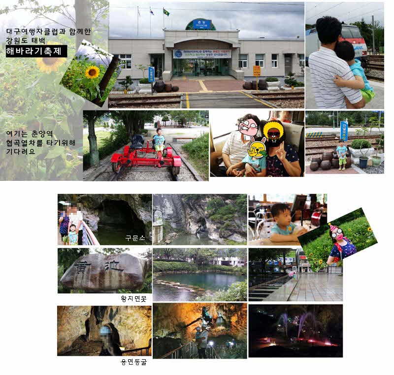 지난 8월 10일 태백해바라기축제에 다녀왔어요 비가 와서 해바라기가 누워있었지만 해바라기축제장 옆 작은 카페에서 해바라기 농축했는 쥬스도 마시고 따그닥따그닥 말 놀이기구도 타고 나름 괜찮았던것 같아요 작은 미니 동물원처럼 염소와 거위도 있고 엄청 큰 개도 있고 볼거리도 있었던것 같아요 해바라기축제장 가기전에 춘양역에 들려서 기차를 탈려고 기다렸는데~~~ 춘양역이 간이역이긴하지만 놀수 있게 작은 기찻길도 있고 레일바이크같은것도 있어서 괜찮았어요. 기차탔는데 꼬불꼬불거리면서 산길을 달리는데~ 기차 옆에 산도 있고 연못도 있고~~ 용연동굴은 부산 태종대 갈때 타는 다람쥐기차잇죠? 그거랑 비슷한것을 타고 동굴 입구까지 올라가는데 용연열차타고 올라가는 재미도 쏠쏠하고 동굴안이 시원하고 동굴에 벽마다 이름이 다 있고 안에 분수도 있더라구요~~ 가이드님도 어찌나 친절하시던지 저희는 아이 동반이라~ 운전기사 아저씨도 장시간 버스에 있는게 지루하지는 않냐면서 수상한 그녀 틀어주셔서.. 볼거리가 많고 알찬~ 이번여행 정말 잊지 못할 소중한 기억, 추억 만들어 주어서 고맙습니다. 블로그에도 후기를 올렸어요 |