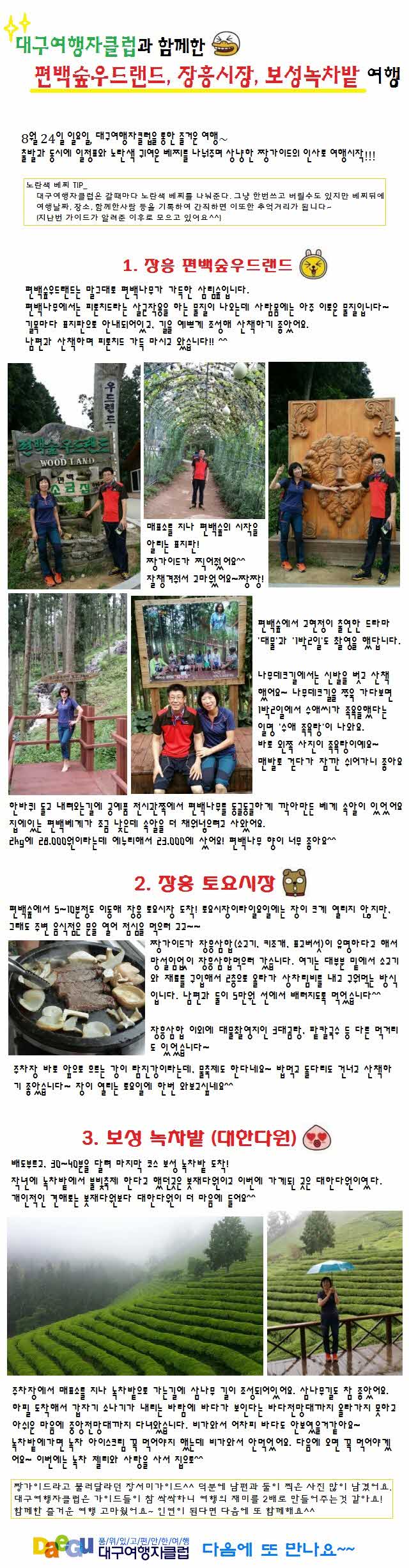 제목 ♥8월24일(일)_편백숲우드랜드_장흥시장_보성녹차밭 후기♥ 등록일 14.08.26 조회 487