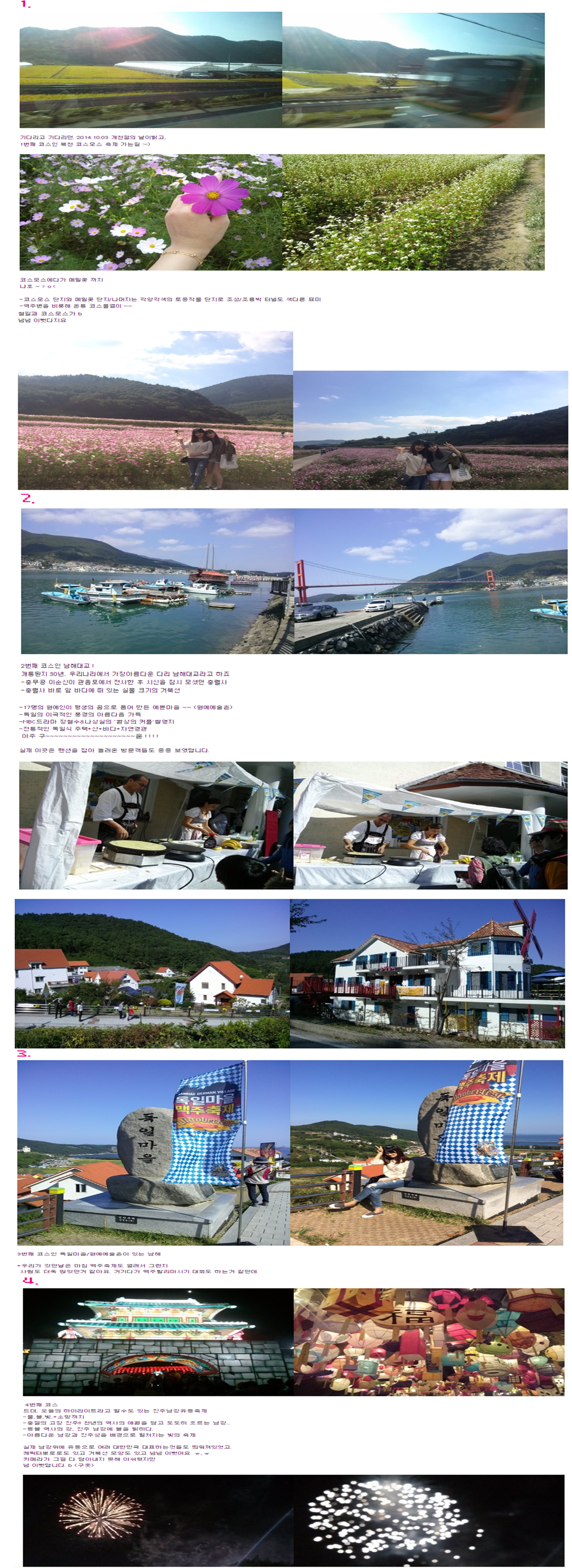 | 제목 | ★우정여행★가을여행★북천코스모스축제,남해독일마을,진주남강유등축제 | 등록일 | 14.10.26 | 조회 | 374 |