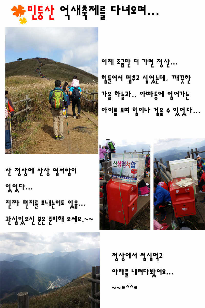 늦었지만, 이제 올립니다.. 고딩때 친구랑 운동겸 스트레스도 풀자고 민둥산을 다녀왔습니다. 사실 저희는 산행은 초보라서 처음엔 올라가는 산을 보고 몇번이고 되돌아가야 하나 걱정했어요.. 그래도 정상까지 오르고 나니 맘이 기뻤습니다... 올라가고 내려올때 저희는 가이드님이 말씀하신 시간보다는 훨씬 많이 걸렸습니다.. 오후 2시에 만나기로 했는데요... 2시까지 억지로 맞추어 내려왔습니다.. 가장 쉬운 코스로 올라갔는데도...꼴찌오르고.. 꼴찌 내려오고... 힘은 들었지만 많은 생각도 하고 나름 보람되고 좋은 시간이였답니다.. 마치고는 단종의 유배지에 다녀왔는데요... 코스가 괜찮았어요... 산을 좋아하신는 분에게는 적극 추천... 산행 초보자이면 조금은 결심을 하셔야 할꺼 같고,,,,, |
