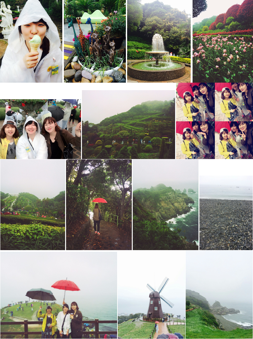 우리의 가장 큰 관심사는 외도에 들어가는 배가 있을지 없을지 여부였습니다. 다행히도 외도에 무사히 도착 할 수 있었고 약 1시간 30분 정도 둘러볼 수 있었습니다. 외도보타니아는 ‘외도+botanic+utopia’의 합성어라고 가이드님께 들었는데 정말 utopia라는 말이 아깝지 않았습니다. 우산, 모자, 비옷까지 각자의 방법으로 비를 조금이라도 덜 맞고자 만반의 준비를 했던 저와 제 친구들은 어느 순간부터 외도의 아름다움에 빠져 비 맞는 것을 신경쓰지 않고 정신없이 뛰어다니며 사진찍기 바빴습니다. 인공적으로 꾸며진 것들과 자연이 잘 어우러진 모습에서 낙원같은 곳으로 가꾸기 위해 누군가가 엄청난 시간을 들여 노력했다는 것을 느낄 수 있었습니다. 몽돌해수욕장에 도착해서는 허기진 배를 채우고자 먼저 밥집을 찾아다녔습니다. 아무래도 해안가라서 횟집이 많았는데, 지역특산물을 맛볼 수 있으면서 좀 저렴한 것을 찾다보니 선택한 메뉴는 해물된장찌개와 성게비빔밥이었습니다. 배가 고파서 그랬던 것도 있겠지만 음식 자체도 정말 맛있었습니다. 다 먹고 나서는 이름처럼 진짜 몽돌몽돌(?)하게 생긴 몽돌을 밟으면서 돌끼리 부딪히며 나는 몽돌몽돌(?)한 소리를 들었습니다ㅎㅎㅎㅎㅎ 마지막으로는 신선대와 바람의 언덕을 갔습니다. 신선대는 갓모양의 바위가 절경을 이루고 있었습니다. 그리고 바람의 언덕에는 큰 풍차가 하나 세워져 있었는데 멀리서 볼 때보다 가까이서 보는 것이 더 멋있었습니다. 언덕을 넘어가니 엄청 넓은 들판과 바다가 펼쳐져 있었습니다. 사진을 분명 대충 찍었는데도 풍경의 힘을 빌려서인지 우리까지 예뻐보이는 효과가ㅎㅎㅎㅎㅎ 좋지 않은 날씨에도 4번의 여행 중 가장 기억에 남는 여행이었습니다. 특히 가이드님께서 전체적인 설명도 잘해주시고, 셀카봉으로도 다 담을 수 없는 멋진 풍경과 우리를 함께 잘 찍어주셔서, 또한 기사님께서도 안전한 운전으로 대구로 잘 돌아오게 해주셔서 감사했습니다. 여행한 날부터 지금까지 같이 갔다 온 친구들과 가장 많이 한 이야기가 ‘우리나라에도 이렇게 구경할 만한 곳이 많았는지 몰랐다.’ 입니다. 하루가 참 길었고, 행복했습니다^.^ |