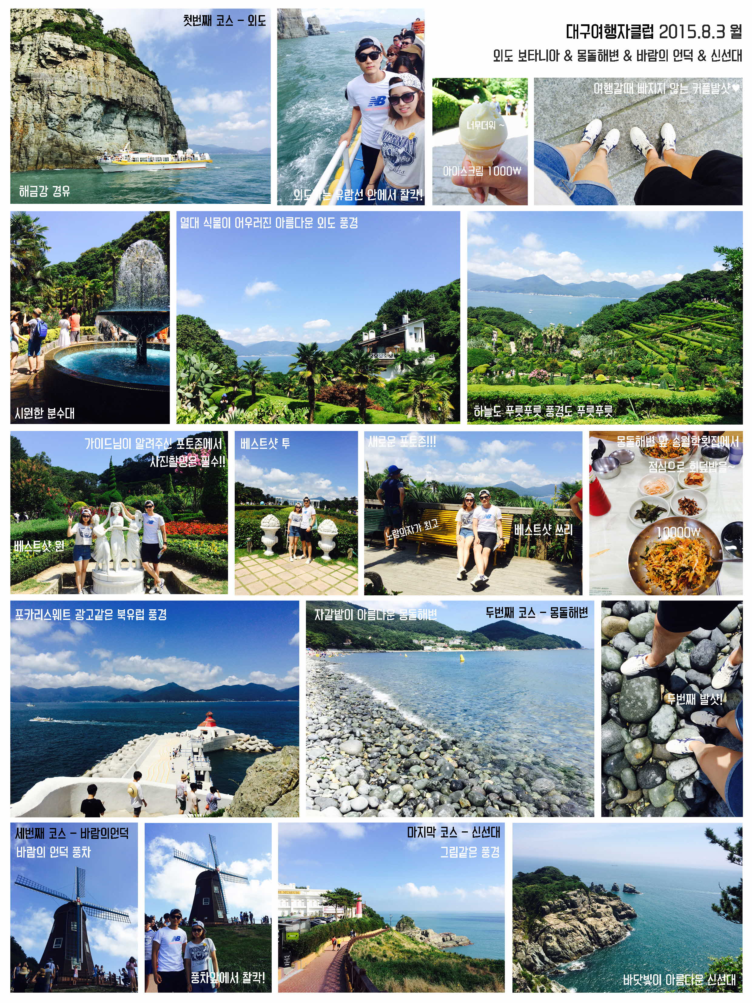 남자친구에게 대구여행자클럽을 처음듣고 가자고 한게 벌써 1년전인데 이제야 휴가를 맞춰서 가게되었네요! 설렘을 가득안고 외도로 출발~~~!! ☆첫번째 코스 - 외도보타니아☆ ☆두번째 코스 - 몽돌해변☆ ☆세번째 코스 - 바람의 언덕,신선대☆ 김지훈 가이드님의 세심한 문자센스와 친절한 가이드로 더욱 즐거운 여행이 된 외도여행! 대구여행자클럽을 통하여 따로 가기 힘든곳을 편하게 가게되어 정말 좋았습니다ㅎㅎ감사합니다!^^