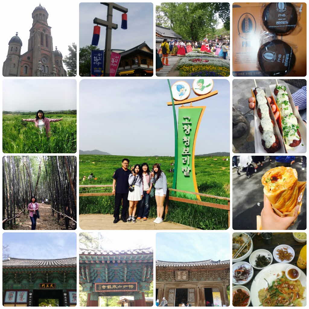 5월7일 올만에 가족여행이 떳다!! 계획은 소매몰도 였으나 인원미달로 취소 되어서 급 행선지 변경해서 떠난 여행이었지만 좋았다. 고창청보리밭은 강풍과 비로 인해 쓰러진 곳이 많았고 냄새가 좀 나서 아쉬웠지만 초록의 청보리가 넘실 넘실 거려서 사진은 정말 잘 나오는 곳이다. 변산내소사는 일주문에서 천왕문까지 전나무 숲길은 천연 피톤치드와 시원한 나무그늘이 정말 환상적이었고 천년된 느티나무와 내소사 대웅전 문살에 연꽃과 수련으로 장식된 꽃문살이 너무 예쁘고 꼭 보실 것을 강추!! 전주 한옥마을은 오목대, 경기전, 정동성당 그리고 한복과 교복을 입은 사람구경, 맛난 음식을 먹는 먹방투어(풍년제과쵸코파이, 길거리야 바케트버거, 촌놈의 손맛 떡갈비 완자꼬치, 아이스크림 등)가 있어 먹는 걸 즐기는 울가족에겐 딱인 듯~~ 좋은 사람과 좋은 경치 그리고 맛난 음식의 먹방투어 3박자가 맞는 가족여행으로 좋은 코스인 것 같다. 항상 스마일로 친절한 이민재가이드와 안전운전해 주신 운전기사님 덕분에 여행이 알차고 예정시간 보다 도착시간도 1시간 정도 빨라서 더 좋았다. 다음 가족여행은 어디로 갈까? 대구여행자클럽에서 다양한 코스를 개발해 주시면 좋을 것 같다.^*^