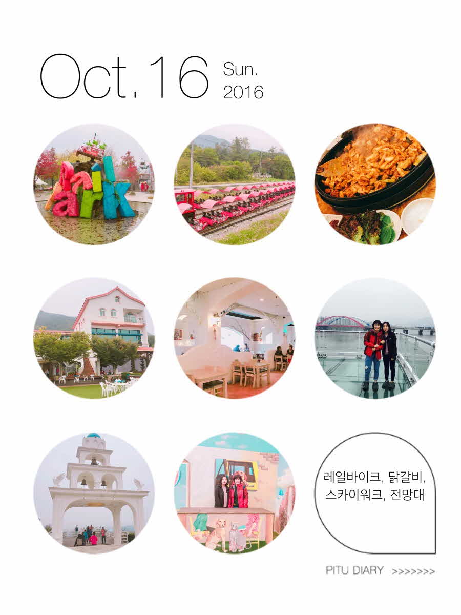 이른 아침부터 출발해 강촌레일바이크를 타기위해 김유정역에 도착했는데 너무 예쁘게 꾸며놓은 풍경에 정신없이 사진찍고 하느라 레일바이크 타기위해 기다리는 1시간이란 시간이 지겹지않았습니다. 드디어 안전교육을 듣고 출발했는데 출발과 함께 시작되는 스릴만점의 경사로를 시점으로 가는 동안 내내 지루할틈이 없을만큼 터널구간과 자연풍경이 잘 어우러져 있어 저절로 "우~와~"라는 감탄사가 나왔고 중간휴게소에 있는 작은 폭포와 낭만열차 또한 너무 기억속에 남을것 같습니다. 신나게 달리고 즐겼을까 배가고파 닭갈비를 정신없이 먹고 스카이워크에서 아찔한 전율을 느끼며 구경하고 있을때 빗방울이 떨어져 잠시 폐장한다는 안내멘트에 조금만 늦었으면 이렇게 좋은걸 못보고 갈뻔했구나 싶어 볼수있게끔 시간조절 잘 해주신 기사님과 가이드님께 감사했습니다.떨어지는 빗방을 맞으며 차에 올라 오늘의 마지막코스인 예쁘게 꾸며진 이국적인 카페 산토리니 정원과 종탑,전망대에서 차 한잔을 마시며 오늘 하루를 정리했습니다. 이른아침부터 시작된 딸과의 여행이 무엇하나 빠지지 않고 예쁜 기억으로 남게 도와주신 빗길에 안전운행 해주신 기사님과 예쁘고 상냥하시고 세심한 부분까지 꼼꼼히 챙겨주신 목소리까지도 예쁘신 이현정 가이드님 오늘 너무 감사했습니다.~~~ |