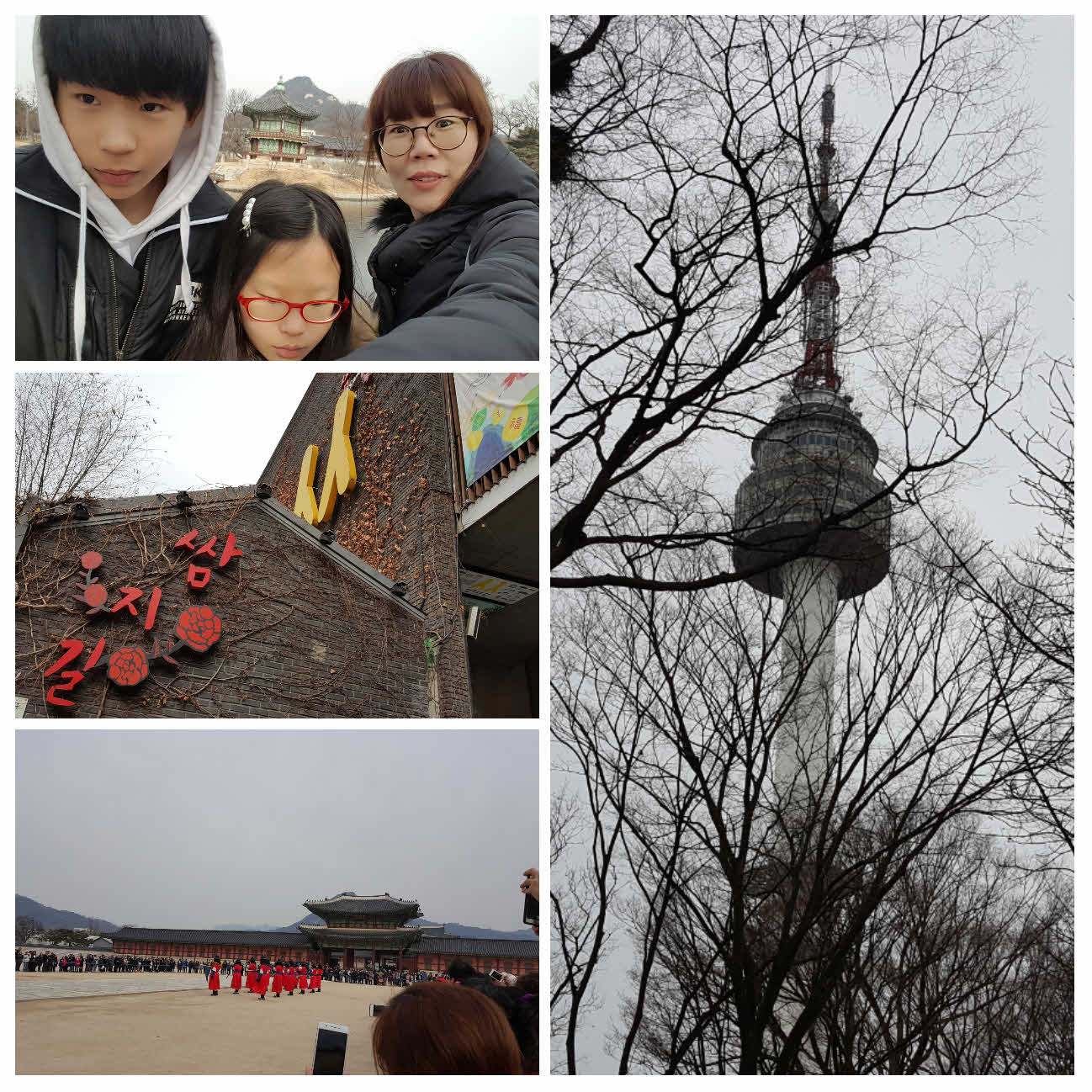 봄방학을 맞이해서 평소 아이들이 가고싶어했던 서울여행을 다녀왔어요. 아이들이 어렸을적 다녀왔던 경복궁은 가이드님의 재미난 설명을 들으며 둘러보니 또다른 느낌이 들고 더 친근하게 느껴졌답니다. 하지만 대구와 달리 확연히 추운날씨에 더 찬찬히 둘러보지 못하고 발걸음을 재촉했던 것이 못내 아쉬웠어요. 경복궁관람을 마치고 주어진 자유여행으론 인사동 쌈지길을 돌아 기념품 몇가지를 사고 이열치열이라했나요? 우린 이냉치냉이라고 냉면을 먹었네요. 하지만 역시나 다 먹질 못하고 남겼다는.. 다음으로 향한 북촌한옥마을은 자세한 이정표가없어 조금 많이 헤맸지만 결국 찾아냈죠. 전통가옥을 유지보수하며 아직도 사람이 살고 있다는게 신기하기도 했고 비싼 서울땅에서 관광객의 소란스러움을 견디며 불편하게 살고 있는 주민들이 애처럽게도 느껴지는 동전의 양면같은 곳이였어요. 아무리 고풍스럽고 옛정취가 물씬풍기는 한옥마을이여도 추운날씨는 더이상 우리를 그곳에 머무르길 두질 않았어요. 아기자기한 카페들이 많았으나 한글간판만 허용한다는 콧대높은 인사동에서 참 정감가게도 스타벅스라는 한글간판을 달고 있는 커피숍을 보고는 바로 고고~따뜻한 라떼로 꽁꽁얼은 손과 발을 잠시 녹이고 우리를 기다리고 있을 관광버스를 향해 빠른 발걸음을 해야했답니다. 마지막 일정인 서울타워가 남아있었으니까요. 휴일이였으나 날씨탓이였는지 생각외로 한산했고 덕분에 사진도 많이찍고 기념품도 여유있게 고를 수 있었답니다. 버스에 올라탄 우리가족들은 따뜻한 온기에 그리고 힘든 여정을 마쳤다는 안도에 그만 잠에 곯아떨어지고 말았답니다. 추운날씨에 친절하고 재미있게 안내해주신 훈남 박도현가이드님 감사했습니다.