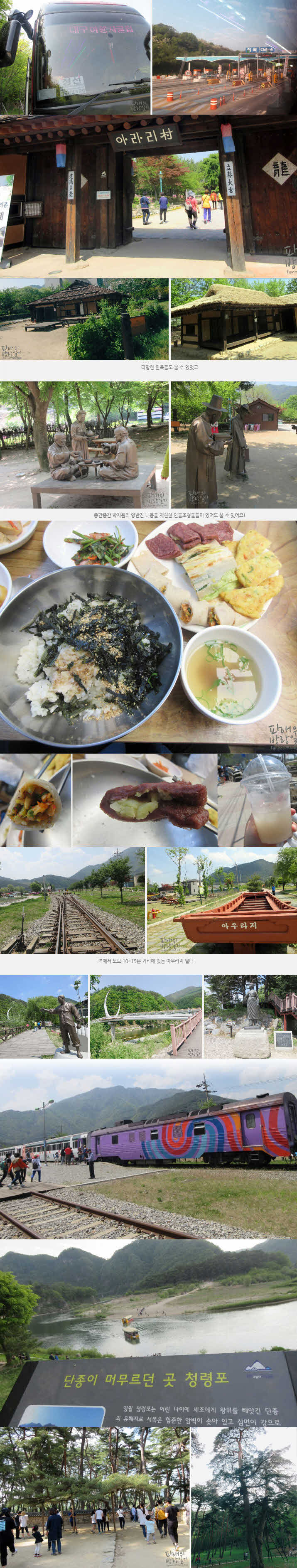 2017 어린이날 이른 아침 강원도로 떠났다~! 강원도 청정자연을 가득 담고온 정선여행ㅎㅎ [아라리촌 > 정선5일장 > 아우라지 > 청령포] 지난번 군산여행 우수후기로 선정되어 오늘 하루는 무료여행이었다+_+ 1. 아라리촌 - 정선의 옛 주거문화를 재현한 곳이 있다. 전통와가와 굴피집, 너와집, 저릅집, 돌집, 귀틀집 등이 있는 일종의 민속촌 같은 곳이였다. 2. 정선5일장 - 전국 최대규모의 민속장(재래시장)으로, 강원도 대표 곤드레, 더덕, 황기 등이 가득했다. 맛있었던 곤드레밥과 특히 메밀전병과 수수부꾸미 강추! 3. 아우라지 - 강물(다리)를 사이에 두고 서로 만나지 못한 처녀 총각의 애틋한 사연이 전해지는 정선아리랑 가사 발상지이기도 하죠. 4. 청령포 - 울창한 송림과 단종의 슬픔을 간직한 육지 속의 작은 섬이였어요. 600년이 넘는 시간 동안 한결같이 이곳을 지켜온 소나무의 자태에 놀랐고, 좀 더운 날씨였는데 소나무 숲에 들어가니 청량감으로 더위가 싹 가시는 느낌이었다.