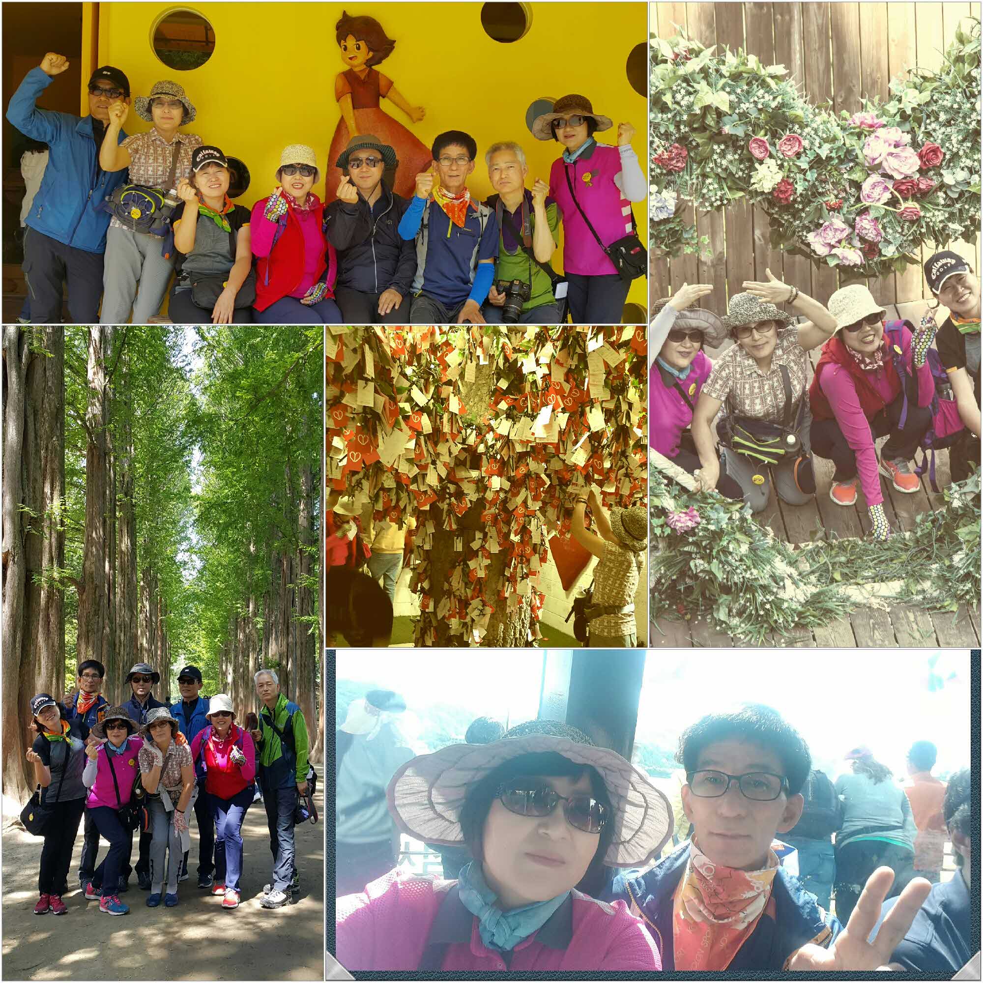 여행자클럽은 음주가무가없고 가이드님의 친절한설명과 장거리 운전걱정 하지않아도 되는 장점이 있어서 우리모두 좋아하는여행이다. 모처럼만에 남이섬여행은 힐링 그 자체였다. 남이섬 나무그늘을 산책하기엔 너무좋은날씨~~ 시원한 강바람과 션하게 달리는 보트또한 답답한 마음을 뻥~하고 둟어주는듯했다. 좋은사람들과 많이 웃고 즐기니 더없는 행복한여행이었다. 하트모양의 꽃속에서 사진찍으며 찍사님의 수그리~라는 말에 어쩔수 없는 나이의 신호인 무릎이아프다고 아우성을 치면서도 깔깔거리며 사진도 찍고.... 잠시나마 나이를 잊고 마치 소녀시절로 돌아간 기분이었다. 스위스테마파크에서는 소원나무에 소원도 써서 달면서 마음속으로 기도도하고.... 저 나무에 메달린 수많은 소원들이 다 이루어질수 있기를 기도해본다. |