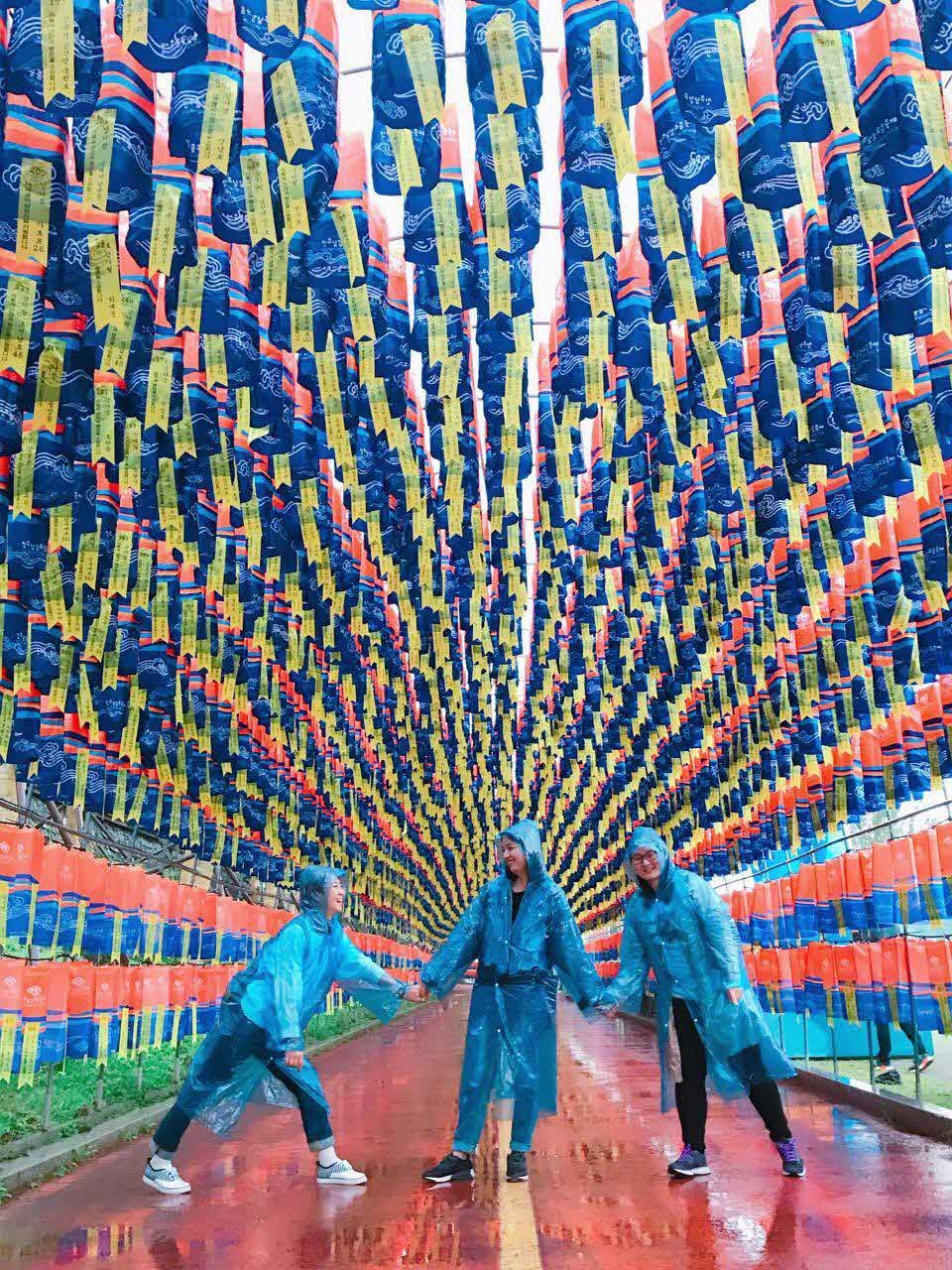 버스안에서 가이드님이 비가 올수 있다는 말에도 설마 그걸리가~ 그런일은 나한테 일어나는 일이 아니라고 생각했는데 꽃구두앞에서 사진을 찍자마자 내얼굴에 새똥같은 빗방울이 떨어지고 내 맘은 이미 새똥같은 눈물이 떨어졌다 우산도 우의도 없다 우리는 아무도 불평하지 않았다 우의를 같은색으로 사입은 우리는 교복을 입은것 처럼 미친뇬 처럼 비맞으며 사진도 엄청 찍어댔다 만들어졌겠지만 우리 중국친구는 카메라를 가져와서 그럴싸하게 찍었다 유등축제 ....참 걱정이 되는 코스였다 그리고 불꽃쇼가 8시 부터라는데 기적이 일어났다 40분 연장이라는... 우리는 축제장 제일 끝에 있는 진주경찰서명예소장연합회가 운영하는 밥집에서 동동주와 닭국(? 대구에는 없음)을 먹고 기분좋게 사진을 또 찍고 불꽃쇼를 봤다 비가 내리고 비를 얼굴에 흠뻑 맞으며 바라보는 나만 좋았으려나