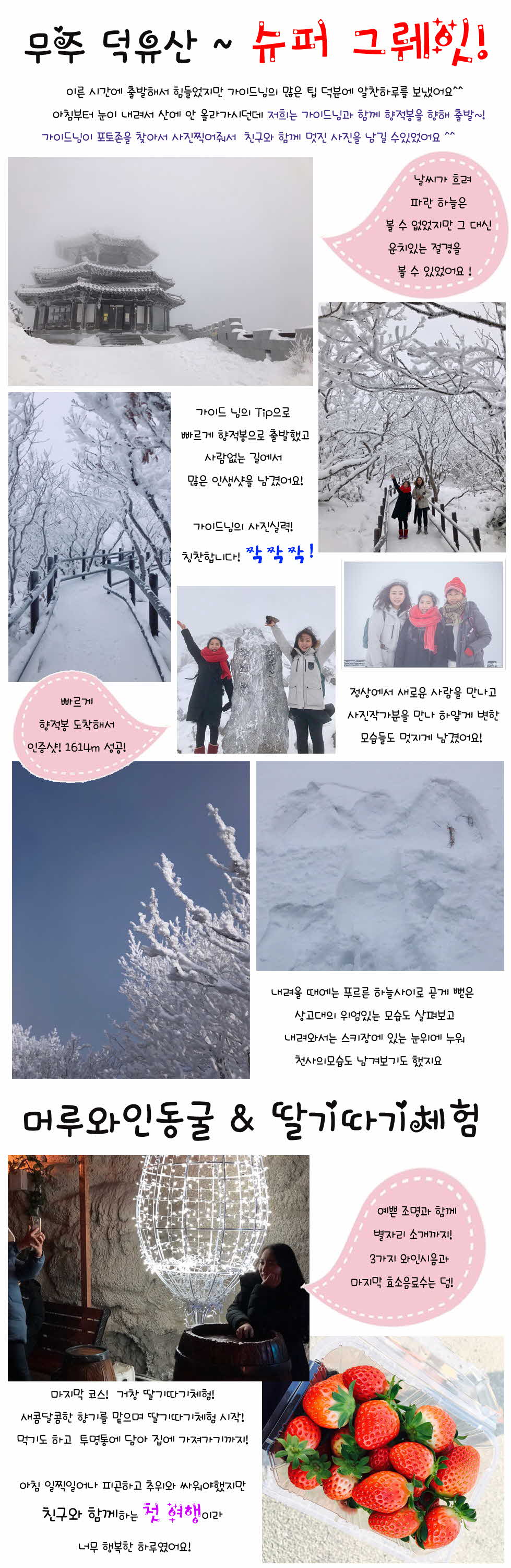 제목 무주 덕유산 향적봉 / 머루와인터널 / 딸기따기체험 강추!! 등록일 18.01.15 조회 623
