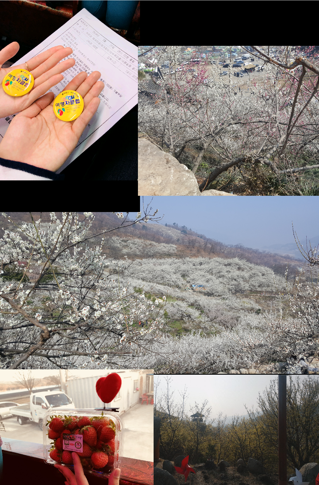 매화가 100%만개했다는 가이드의 얘기를 듣고 기대를 하며 축제장을 도착했어요 가는 길이 편도 1차선.... 굉장히 길이 막혀 예상 시간 보다 늦게 도착했지만 충분히 시간을 줘서 구경을 잘 했습니다 다음은 화개장터로 떠났습니다 화개장터 노래를 흥얼거리며 금방 도착했어요 장터가 작아서 생각보다는 볼 거리도 적었어요 밥만 먹고 버스에 타서 쉬다가 다음 장소로 떠났습니다 산수유축제에 가서 소원종이도 매달고 사진도 찍고 버스킹 공연도 보니 금방 시간이 갔어요 마지막으로 기다리던 딸기따기!! 기사님이 시간이 안되면 딸기따기를 못할 수도 있다는 충격적인 이야기를 들었는데 결국은 잘 갔습니다~~ 딸기따기가 너무 즐겁고 달았습니다 맛있었어요 제일 재밌었어요 다음에도 또 이용할께용 |