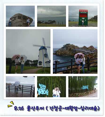 (근데 전 울산만 가면 비가 오네요.ㅠㅠ ) 그런데 생각보다 많은 비가 내려 조금 당황하기도 했어요. 그렇게 버스에 탑승하고 가이드님의 설명을 듣고 쉬기도 하며 그렇게 첫 코스인 간절곳에 도착했습니다. 도착 전 엄청나게 비가 많이 왔는데 다행히 비가 오지 않았답니다. 간절좆을 제대로 둘러본 것 이번이 처음인 것 같아요. 예전에 친구들과 놀러 갔을 땐 무지 바람이 불거나 무지 비가 많이 와서 돌아다닐 수 없었는 데 이번에는 돌아다니기 딱 좋은 날씨(?)였어요.ㅋㅋㅋ그렇게 천천히 둘러보다 커피숍에서 따뜻한 커피도 한 잔한 후 다시 버스에 탑승했답니다. 버스에서 대왕암으로 가며 무얼 먹을까? 엄청나게 고민을 했어요. 사실 대왕암 주변 식당의 음식들이 제 입맛엔 그닥ㅠㅠㅠㅠ 그래도 밥이 먹고 싶어 두군데의 식당 중 맨 앞 쪽에 있는 식당으로 갔어요. 다른 곳은 비빔밥 메뉴만 제 눈에 보이더라구요. 전 비빔먹는 걸 정말 싫어하는 지라.ㅠㅠ 어쩔수 없기도 했구요. 식당에서 밥을 맛있게 먹고 대왕암 이곳 저곳을 둘러보며 그동안 받았던 스트레스가 다 날라가는 것 같았답니다. 그 뒤 십리대숲도 둘러보며 정말 힐링이 되는 것 같아 너무 즐거웠답니다. *1일(토)에 갑자기 연수가 잡혀 또 울산을 가는 데 연수 끝나고 저녁에 십리대숲을 한번 더 가려해용.조명을 설치해서 야간에도 개장하는 것 같더라구용... |
