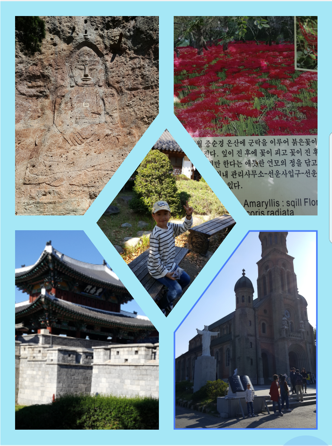 붉게 물든 꽃무릇 보러 갔다가 꽃이 진 모습에 아쉬웠지만 1시간 넘게 걸어 올라간 선운산에 신비로운 모습의 우릴 환하게 반기는 마애불이 있어 힘이났다. 전주한옥마을은 조선시대로 시간여행 온 듯 한옥의 고풍이 느껴졌다. 전동성당의 아름다움과 최명희 문학관에서의 원고지 써보기 체험,풍년제과의 수제 초코파이 맛보기 등등..구경거리가 넘 많아서 또 방문해야겠다.가을바람에 몸을 맡기며 아이와 소중한 추억을 오늘도 쌓고 와서 참 행복한 시간이었다. 안전을 위해 고생해 주신 기사님과 세심하게 여행정보 주시며 매우 친절한 짱가이드님 감사,또 감사합니다..