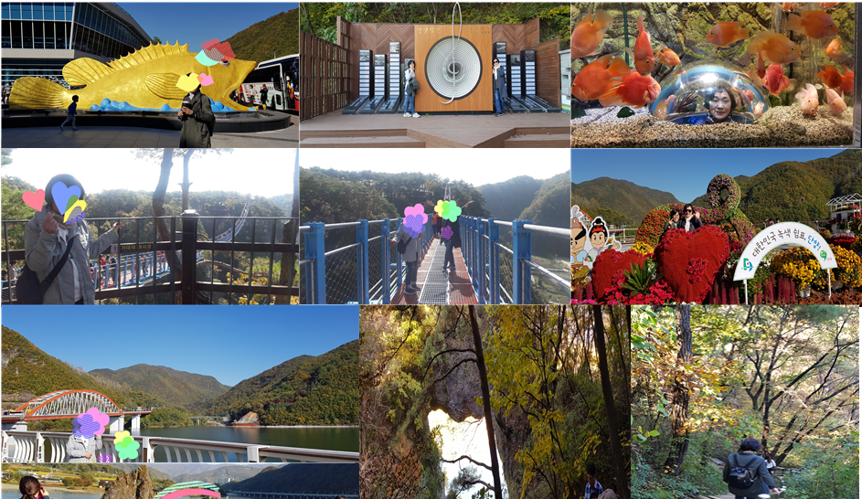 10월 20일!! 남편과 여행을 자주 하다 요번엔 모임에서 언니들과 함께 소금산을 가게 되었어요, 좋은 맘 반 걱정반이었죠. 왜냐구요? 제가 고소공포증이 있어서 출렁다리를 건너갈수 있을까 걱정부터 했는데 생각보다 무섭지 읺아서 맘껏즐겼고 도담상봉과 아쿠아리움도 색다른 고소한 재미를 느꼈고 무엇보다 언니들이 좋아하는 모습을 보니 여행가자고 제의한 내 자신이 뿌듯했어요.점심을 먹고 도담상봉을 보고 바로 석문을 올라 가는길은 배부른 상태에서 가파른길이 숨이 찼지만 그 또한 색다른 묘미를 느낀것 같아 좋얐고 언니들과 좋은 여행을 다녀와서 너무 좋았어요.친절한 가이드님의 세심한 배려와 귀에 쏙쏙 들어오는 많은 정보덕에 알찬 여행이었고 운전기사님의 안전운행덕에 무사히 언니들과 잘 다녀와서 여행자클럽에 다시 한번 감사함을 느낍니다.