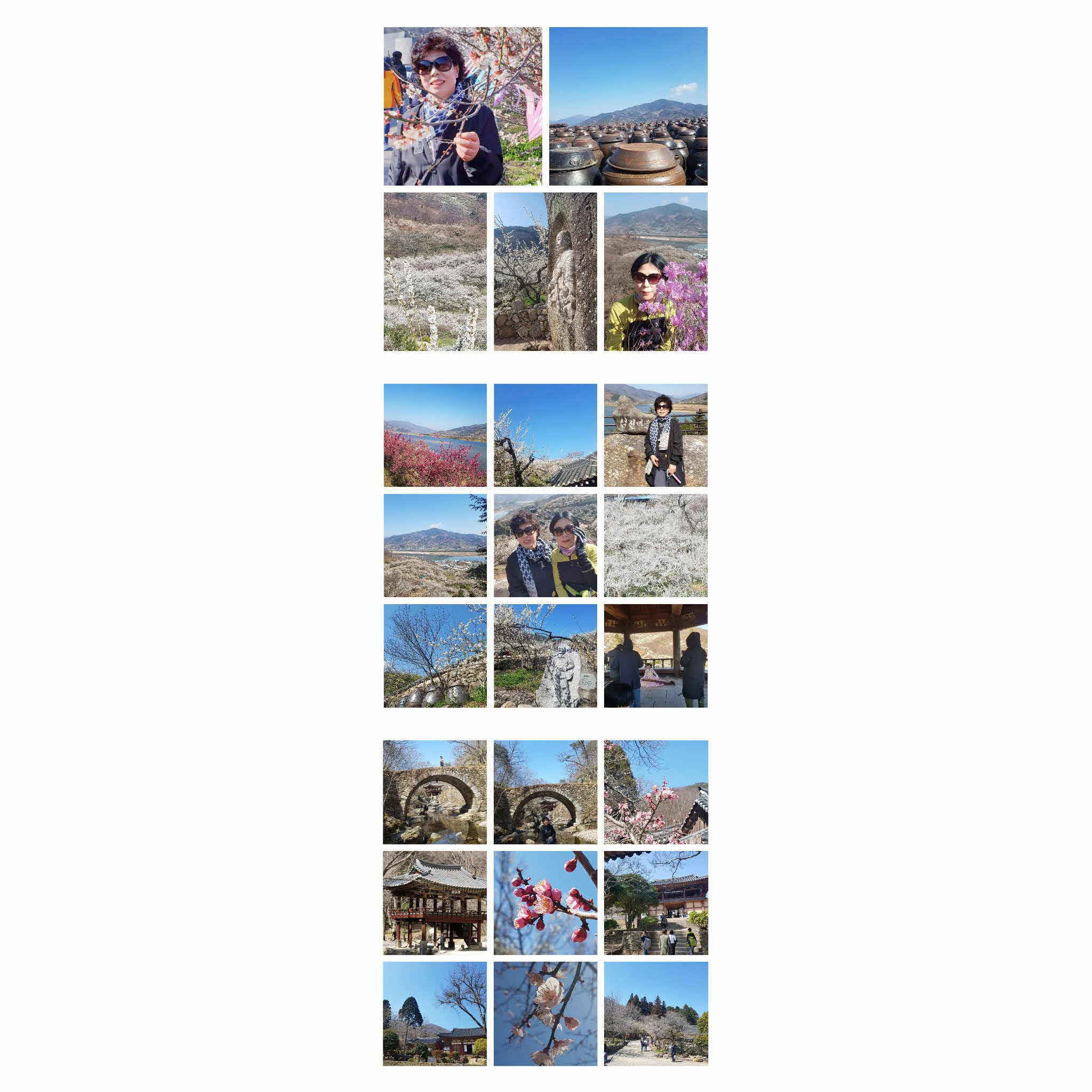 봄마중으로 대구여행자클럽을 통해 지인가 함께 광양매화 축제에 갔습니다 많은 인파로 붐비긴 했지만 꽃 향기에. 취하고 눈이 내린듯. 하얀 꽃잎에 반해서 불편함은 사라지고 황홀한 시간을 보냈답니다 섬진강이 내려다 보이는. 매화밭 언덕에서의. 추억하나를 마음에 담아.선암사로 갑니다 봄이면 꽃대궐이라는 기대를 안고 갔지만 아직은 이른감이. 있어 좀 안타깝네요 하지만 늘 가보고 싶었던 곳이라 넘 좋았어요 승선교 아래에서 사진도 찍고 선암사도 아기자기하고 손 타지 않은게 너무 좋더라구요 먼저핀. 매화를 카메라에 담아 보았습니다 기사님 가이드님 수고하셨습니다 보람찬 여행을 하고왔어요