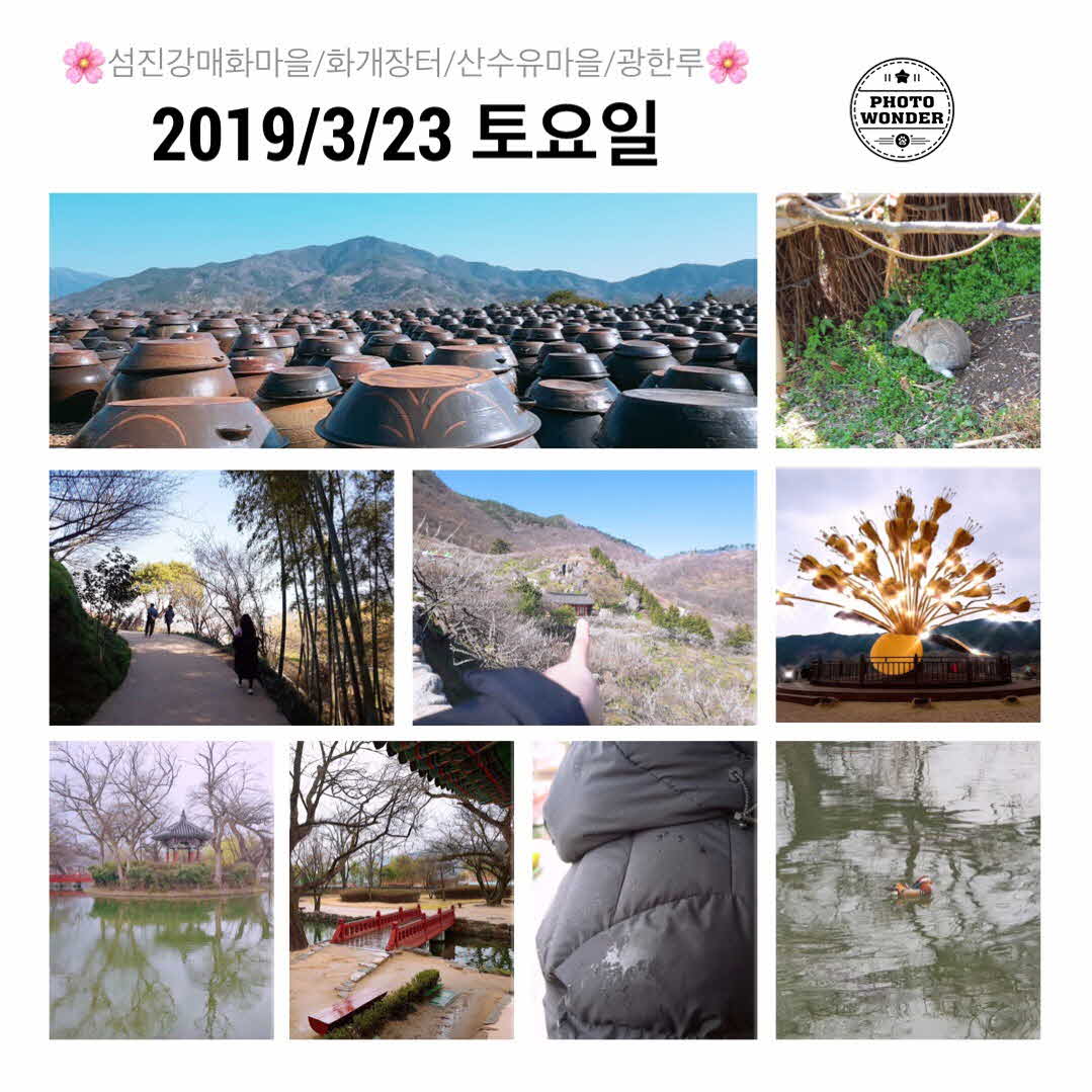 매화는 살짝놓치고말았다 ㅜㅜ 지난주가 만개였다고.... 알고는 있었지만 실제로 보니 정말 매화는 다~~지고 없었다ㅎㅎ 하지만! 그래도 광양 청매실농원은 이뻤다~매화는 졌지만 장독대~섬진강~대나무숲 등 이쁜 포토존도 곳곳에 있었다. 사진을 찍기보다는 여유롭게 산책해야지 하는 마음으로 걸어다녔는데 의외로 사진도 많이찍었더라 ㅎㅎ 매실 아이스크림도 한개 먹어주고~^^ 다음장소로 이동하였다 다음장소는 화개장터였다. 여기는 처음와보는 곳이었는데 다음 장소는 이번여행의 메인이라고 생각했던 구례산수유마을!! 다음 장소는 예전에 한번 가본적있는 남원 광한루였다 기사님이 운전을 잘해주셔서 오늘 차만 타면 꿀잠을 자고 ㅎㅎㅎㅎ 대구까지 갈때도 거의 깨지도 않고 꿀잠을 자며 도착해 장시간 버스를 탔는지도 몰랐다 ㅎㅎ 감사합니다 기사님^^!!👍👏🏻👏🏻👏🏻 대구여행자클럽 가이드님과 기사님 덕분에 항상 더 편하고 즐거운 여행을 하네요^^! 감사합니다 다음에 또 뵈요 ❤