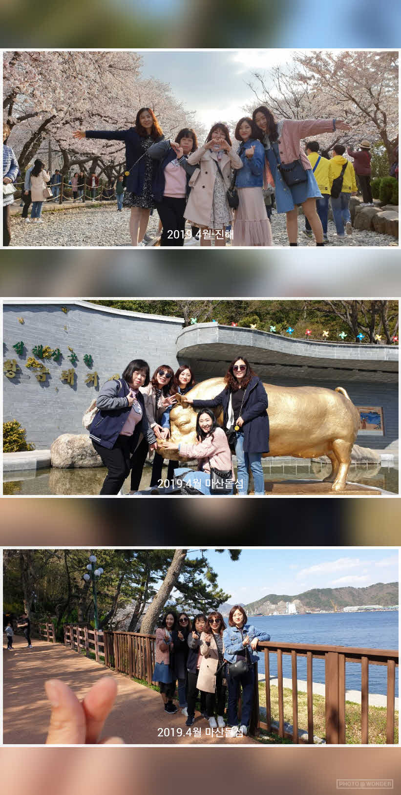 봄.가을  일년에 두번정도 대구여행자클럽을 통해  그녀들은 여행을 떠난다  조용하고 편하고 가이드도 넘 친절하다 이번 장정웅 가이드도 유머와재치가 있어 좋았다  봄의 끝자락에 벚꽃도 이뿌고 차가운 봄바람의 바닷길 돝섬도 힐링하기에 최고였다 많이 웃고 떠들고  고딩졸업이후 처음만난 진해친구도 반가웠다  다음번에도 여행도 떠나고 친구도 만날수있는 대구여행자클럽을 이용할 생각이다