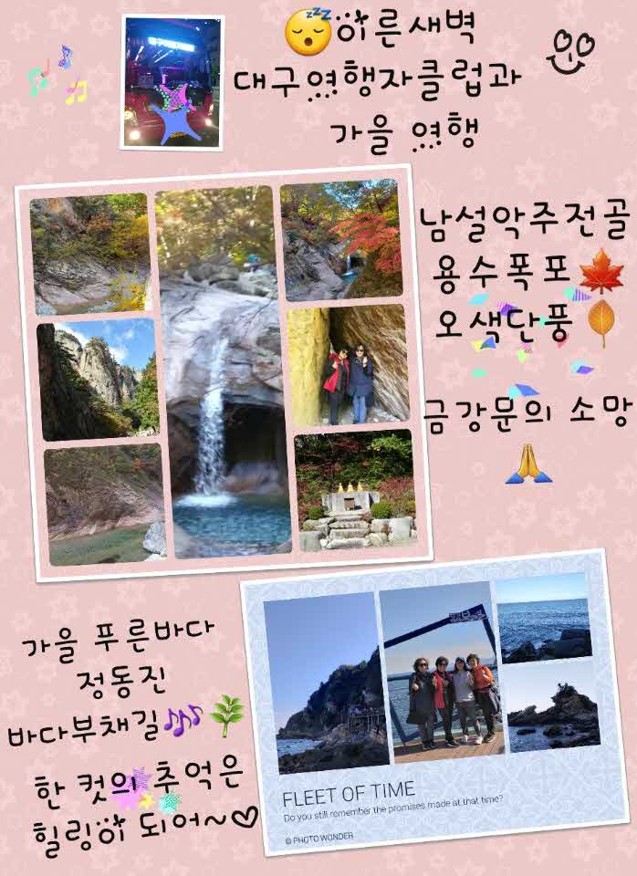 날씨도 좋고, 사람도 좋고, 인파들은 많고... 단풍놀이의 용수폭포 인사인해 하고...ㅠ 산채비빔밥을 먹고.. 다시 이동한 곳은... 정동진 바다부채길...둘레길... 푸른 바다에 눈을 담고... 남설악의 절경도 정동진의 바다도... 오신 분들에게 모두 힐링의 시간이 되었을 것이다. 아이들 어릴 때 만나 이어 온 인연이... 아이들은 대학생이 되고 이제 직장인이 되어... 우리는 중년을 넘어.. 파도의 세기처럼 깊어 건강하게 즐겁게 살자^*^ 한 컷의 추억에 세월은 흘러간다.. 대구여행자클럽과 맺은 인연에 감사 하며-. |