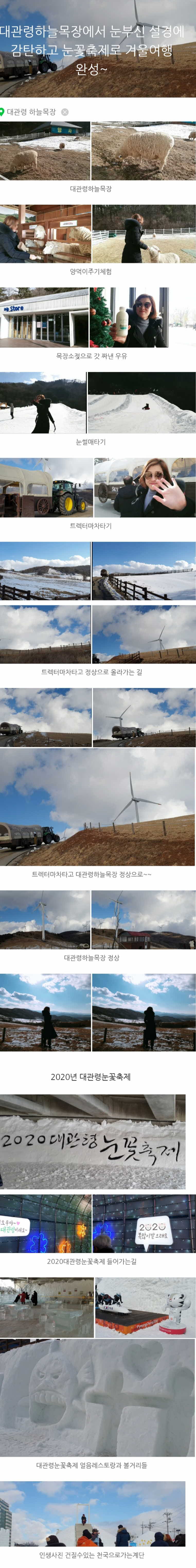 제목 대관령눈꽃축제에서 다양한 볼거리와 대관령하늘목장에서 눈부신 설경을 만나고 왔습니다 등록일 20.01.22 조회 2,722