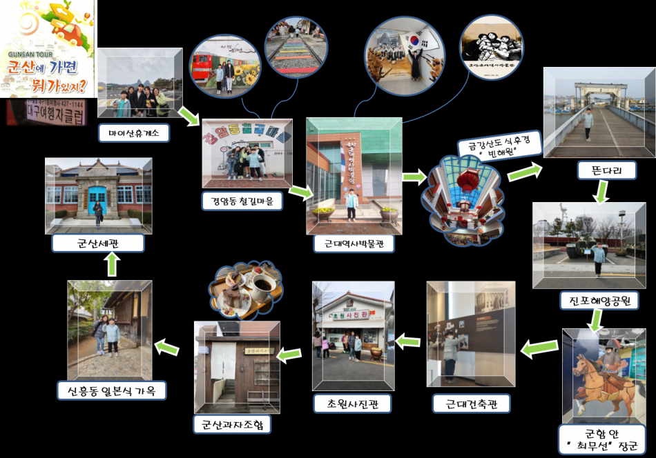 3월1일, 삼일절~ 삼일절 연휴이기도 하고, 개학을 앞두고 여행을 떠날까 하는 맘으로 가볍게 출발한 군산여행. 언니, 조카, 두 아들과 설레는 맘으로 처음 가보는 군산행 버스에 올라탔어요. 무엇보다 중2 사춘기 아들과 이제 막 사춘기가 시작될 5학년 아들과 버스 여행을 한다는 생각에 설렘반, 걱정 반으로 군산 여행은 시작되었답니다. 모든 여행객들이 탑승 후 "허미정 가이드"님의 또롱또롱한 안내로 군산여행이 더 설레고 기대되었습니다. TV에 소개되서 더 유명해졌다는 곳이라고 하더군요. 가이드님의 강추 휴게소인 "마이산휴게소"에서 간식을 간단히 먹으며 멋진 마이산을 감상하며, 무엇보다 중2 아들이 마스크를 벗고 단체로 사진을 찍었다는 겁니다. ㅎㅎ 가이드님의 깨알도움(?)이 있었기에 가능한 일이었죠.ㅋㅋ 얼마쯤 갔을까?첫 도착지인 '경암동철길마을' 어린시절 추억이 새록새록 돋는 물품들(어릴적 오리고 놀던 종이인형, 종이딱지, 우리집 TV위 못난이 3형제, 불량식품들~, 달고나 등)을 보며 언니랑 " 우리 그때 이러고 저러고 놀았지? 그때 구체관절인형도 하나 없었지. 그래도 그떄 즐거웠지?"하며 추억 여행을 잠시 떠나고, 철길을 걸으며 쫀득이도 사먹고 기념촬영도 하고 나온 후 "근대역사박물관'으로~ <노란색 대구여행자클럽 뱃지>를 보여주며(뱃지를 보여주면 프리패스 되는 ㅋㅋ) 입장! 여기서부터 '아~ 오늘, 아이들과 오기를 참 잘했구나!' 하는 생각이 드는 장소였어요. 돌아보며 그 시절 아픔의 역사를 살펴보며, 잠시 숙연해지기도 하고, 분개하기도하고, 오늘날 이 자리에 우리가 잘 살 수 있음에 감사한 마음도 가졌던 시간들이었어요. 이것저것 체험할 것, 볼거리가 많아서 아이 동반한 여행은 더 없이 좋았어요. 투어시작할 때 근대역사박물관에서 스탬프투어책자를 가지고 시작하면 좋을 것 같아요. 그 스탬프 찍는 재미에 더 열심히 돌아볼 수 있었던 것 같습니다. ^^금강산도 식후경~ "빈해원"을 찾아가서 해물이 들어간 시원한 군산짬뽕과, 구수한 국물의 일반짬뽕, 달큰한 짜장면, 바삭한 탕수육까지 야무지게 먹었답니다. 중국 어느 식당에 와있는 듯한 오묘한 기분이 들었던 장소였고, 제가 봤던 영화 '남자가 사랑할때'의 배경이 된 곳이라 그 장면이 떠올랐던 곳이었습니다. 기분좋게 나와서 "근대미술관과 장미 갤러리"까지 둘러본 후 "뜬다리"를 지나 "군함"으로 가기위해 "진포해양공원"을 걸었어요. 진포해양공원에 전시된 각종 탱크, 전투기 등을 보며 그 스케일의 웅장함을 감탄하며 "군함" 속으로 들어가 영상관에서 짧은 영상을 보며 '최무선'장군과 진포해양대첩에 대해 알아보는 시간들을 가지고 여러가지 조형물에서 재미있는 사진도 찍었답니다. 2층은 이제 개방하지 않는다고 하여 아쉬웠지만 해양대첩에 대해 더 이해할 수 있었던 시간들이었어요. 다음으로 "근대건축관" 벽면에 작은 얼굴 수백명이 조각되어 있는 곳에서 12명의 독립운동가를 찾아보고, 2층으로 올라가서 독립운동과 관련된 자석퍼즐도 맞추고, 일제 강점기 시절 최대부호였던 일본인들, 유리관 안에 전시된 그들이 살았던 가옥들을 둘러보며 2층 계단 앞 일본군이 조선인을 발로 차는듯한 조형물을 보며 잠시 생각에 들게 했던 곳이었답니다. 너무 많이 걸었나~ 아픈 다리를 잠시 쉴 겸 카페를 찾아 가자~~~ 이왕이면 "초원사진관"도 보고 좀 독특한 곳을 찾아가보자 하여 들른"군산과자조합" 외관은 카페가 아닌가~ 하다 2층으로 올라가니 또 다른 느낌의 카페와 특히 '스콘'이 너무나 맛있었던 곳이었어요. 날씨가 따뜻하면 야외 테라스도 강추합니다. 잠시 달달한 디저트와 차류를 먹으며 쉬고난 후, 신흥동 일본식가옥을 가보았어요. 영화 속에 와 있는 착각이 드는 곳이었고, 일본식 건물은 공통적으로 전면이 유리로 되어있나? 전면이 유리로 되어있는 이유가 뭘까? 하는 생각도 해보며, 야외 정원을 보며 정원감상을 위해서인가? 이런저런 생각을 하며, 꽃이 많이 피는 따뜻한 날에 다시 와보고 싶다는 생각을 하며 나와 마지막 여행지인 "군산세관"을 갔어요. 근대역사박물관 다음으로 바로 가려했는데, 못찼아서 제일 마지막에 갈 수 있었답니다. 알고보니 근대역사박물관 우측편에 바로 있어요. ㅎㅎ 결국 스템프 투어 책자에 있는 장소 미션을 완수하고, 근대역사박물관 안내소로 가서 기념품<바람개비 태극기>를 받고, 대구행 버스에 올랐습니다. 전체적인 느낌은 경암동 철길마을은 '재미있는 곳이네'하는 생각을 하였다면, 근대역사박물관으로 걸어가는 순간부터 한국에 있지만, 한국이 아닌 듯한 느낌? 옛 일본 느낌? 예전에 가보았던 '대마도'에 와있는 듯한 느낌이 드는 갑자기 해외여행와 있는 기분이 들었어요^^ 1박2일 여행하기도 좋고, 당일 버스투어라면 몇 번은 더 와서 조금 더 여유있게 둘러보고, 바다도 볼 수 있어 힐링도 하면 좋겠다는 생각이 들었어요. 군산이 대구에서 거리가 멀어 잘 없다고 하던데, 3.1절을 맞이하여 이런 여행을 계획해주신 대구여행자클럽,그리고 "알!잘!딱!깔!쎈!" -알아서 잘 딱 깔끔하게 쎈스있게 !-여행을 잘 이끌어 주신 '허미정가이드님', 친절하셨던 실습가이