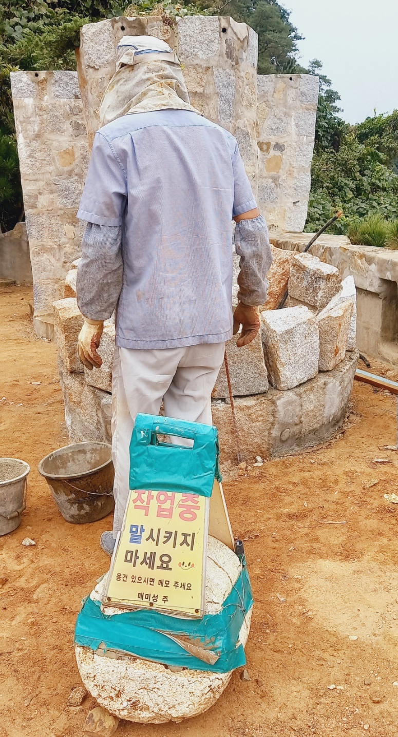 이른 아침부터 종종걸음으로 출발지를 향한다. 아파트 3층 높이의 거대한 성, 거제도 관광 1번지라는 거제 매미성 도착 매미성은 태풍 ‘매미’로 경작지를 잃은 시민 백순삼 씨가 바위 위에 15년이란 오랜 시간 쌓아 올린 성벽인데 설계도가 따로 없단다. 머릿속에 설계도가 장착된 것이라고 한다. 매미성에 도착한 이 날도 손수 작업을 하고 계신 인간 승리의 모습을 본다. “작업 중. 말 시키지 마세요” 수건을 두른 모자를 푹 눌러쓰시고 묵묵히 삽질을 하시는 모습에서 대단함을 느낀다.