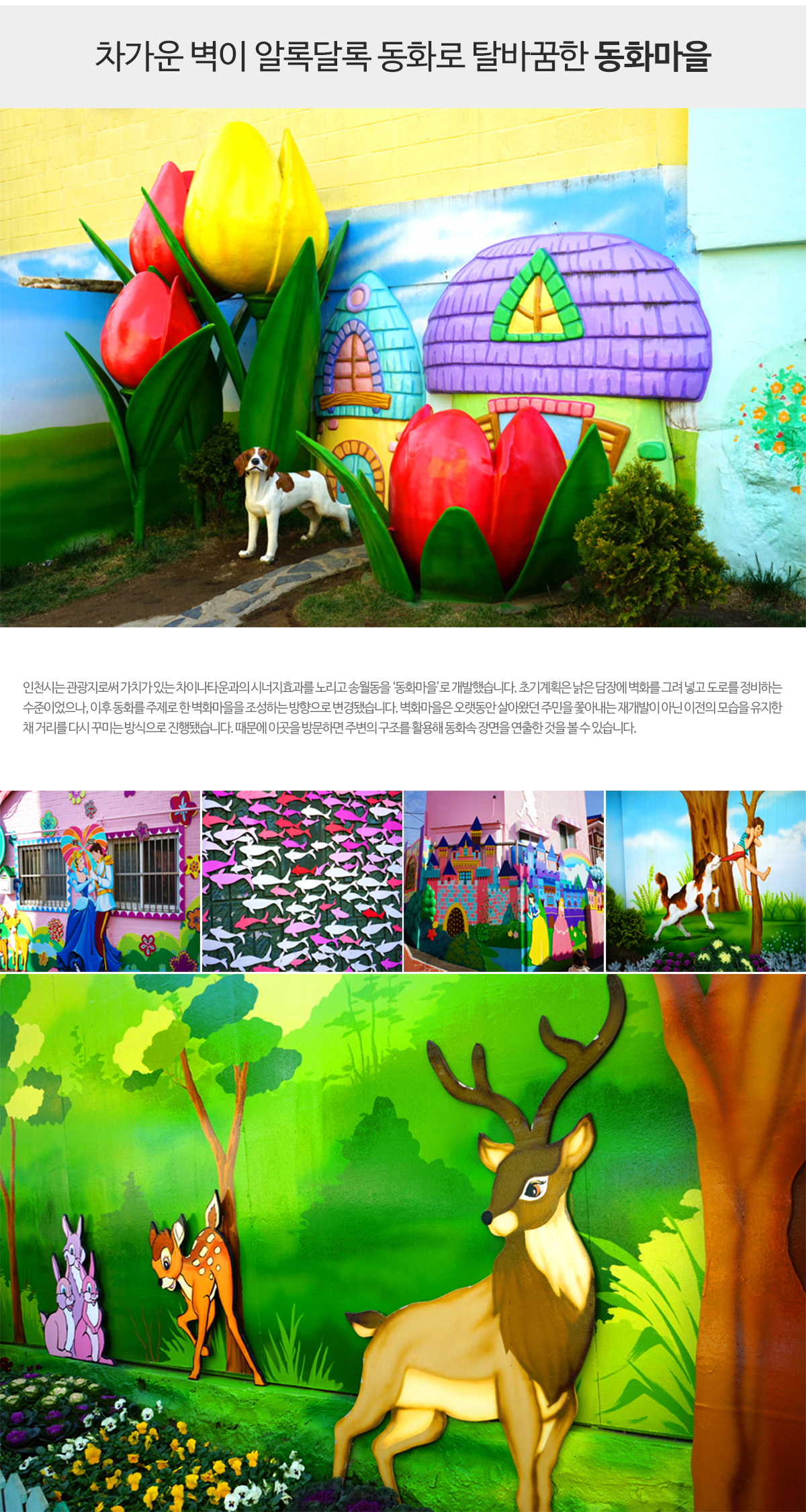 - 재개발이 아닌 이전의 모습을 유지한채 동화를 주제로 조성한 아기자기한 벽화들