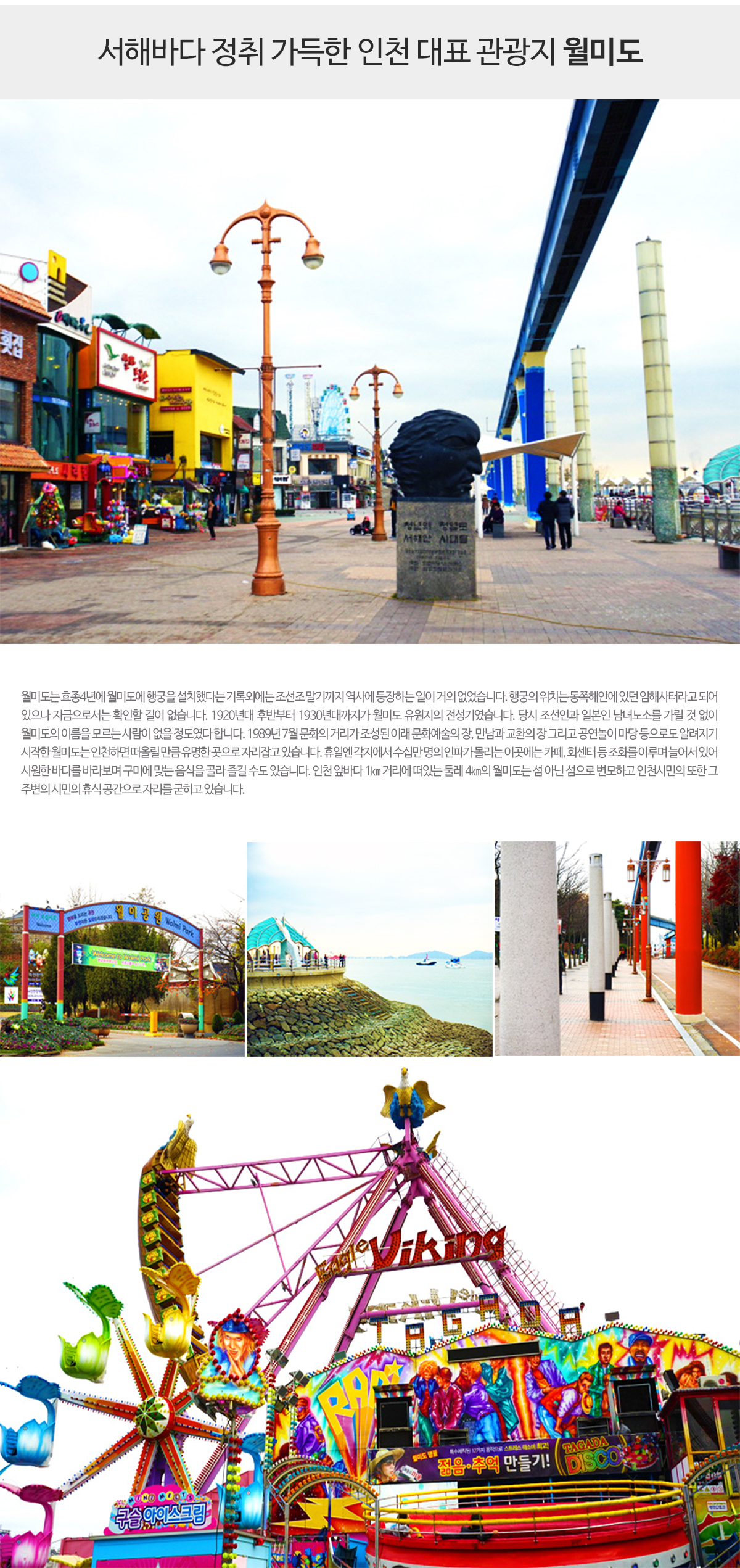 - DJ로 유명한 디스코팡팡과 스릴있는 바이킹으로 유명한 월미도에서 추억을 되새겨 보세요.
